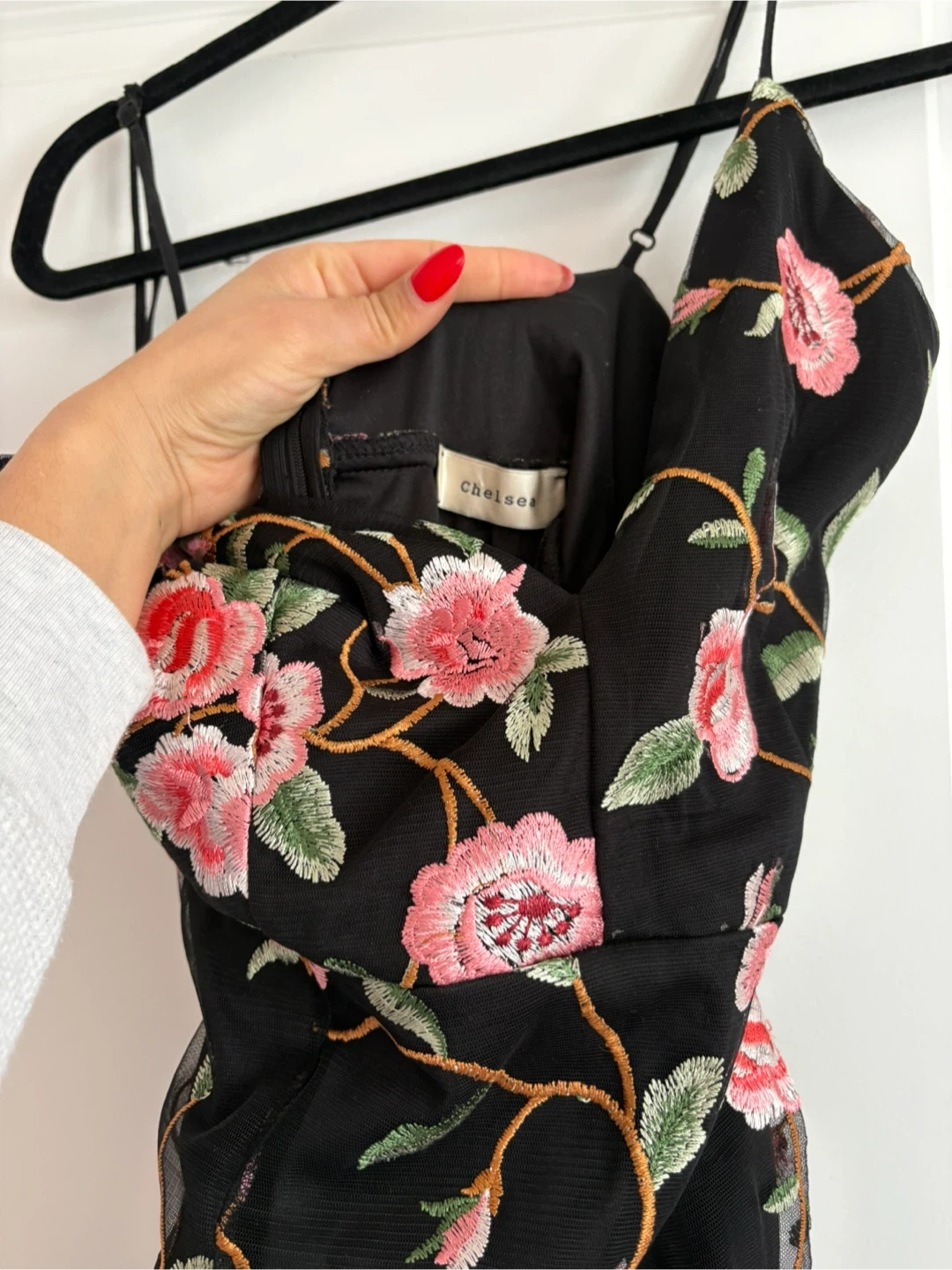 This stunning black gown by Chelsea & Violet features delicate pink and green floral embroidery throughout. The mesh overlay adds a beautiful texture, perfect for a special occasion. It has a flattering V-neckline and a sleek, form-fitting silhouette.