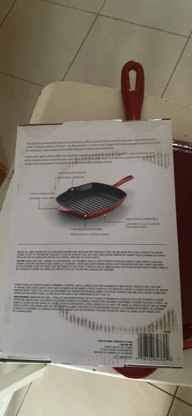 Enameled cast iron grill pan. Induction compatible, chip-resistant, double pouring spouts. Extra handle grip. Oven, broiler and grill safe.