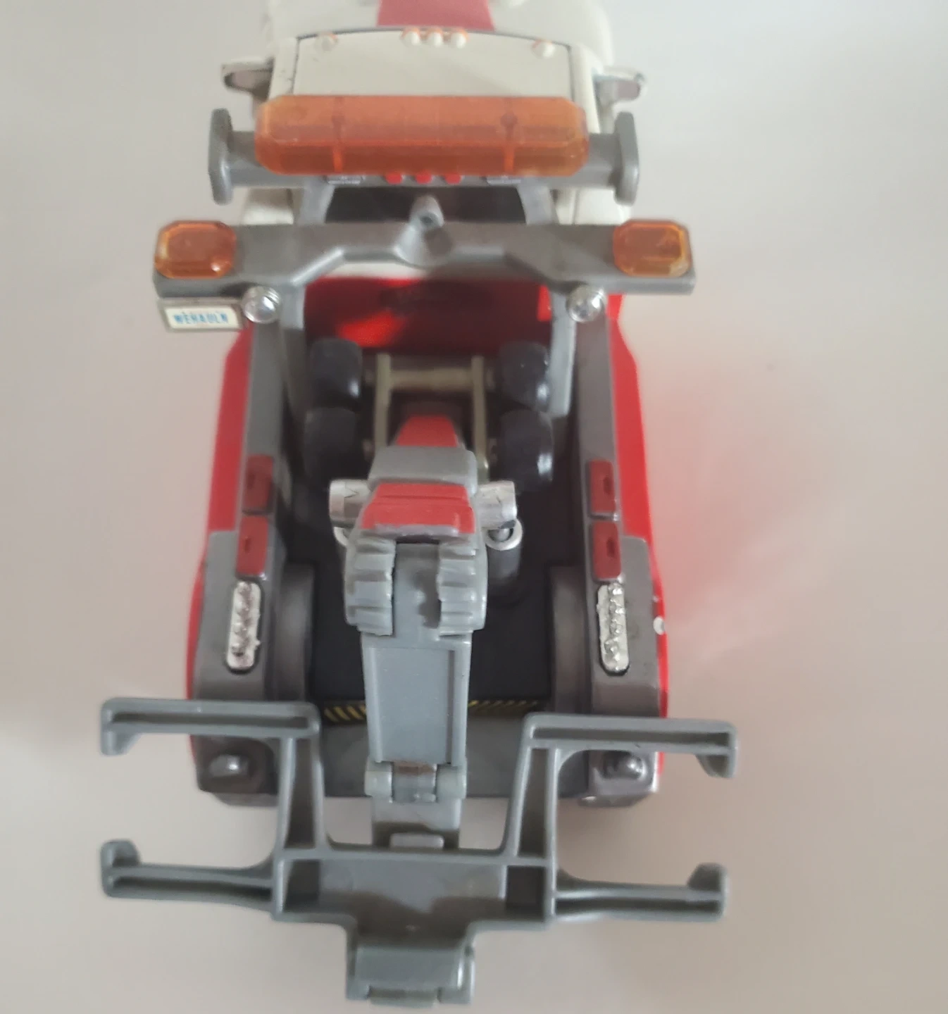 This is a toy tow truck with realistic details. It features a white and red cab with "BIG RIG Towing" graphics. The rear tow mechanism is articulated. It's a fun toy for vehicle enthusiasts!