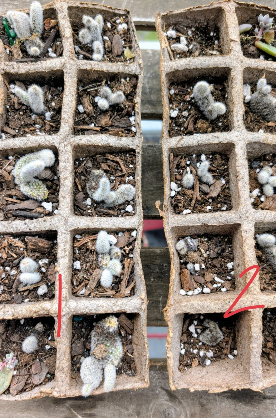 2 Collection of small, fuzzy cactus and succulent propigates ready for a new home and pots. Each cell contains a unique cutting. Peat pots are biodegradable and suitable for planting directly.