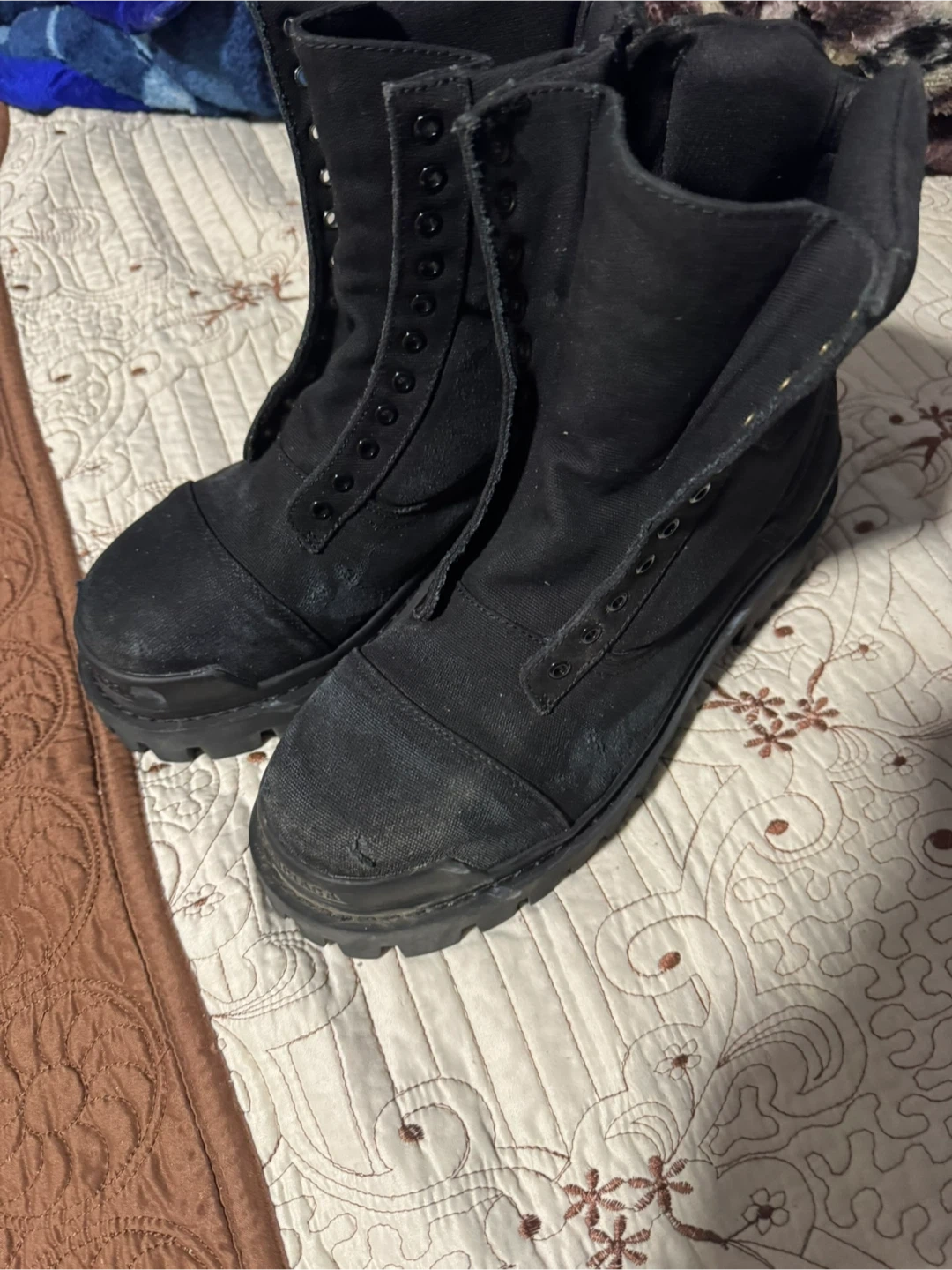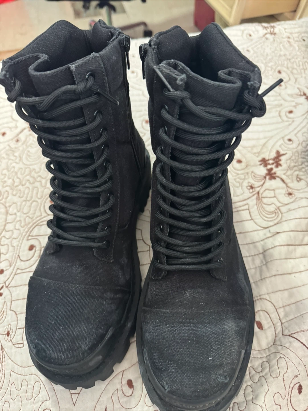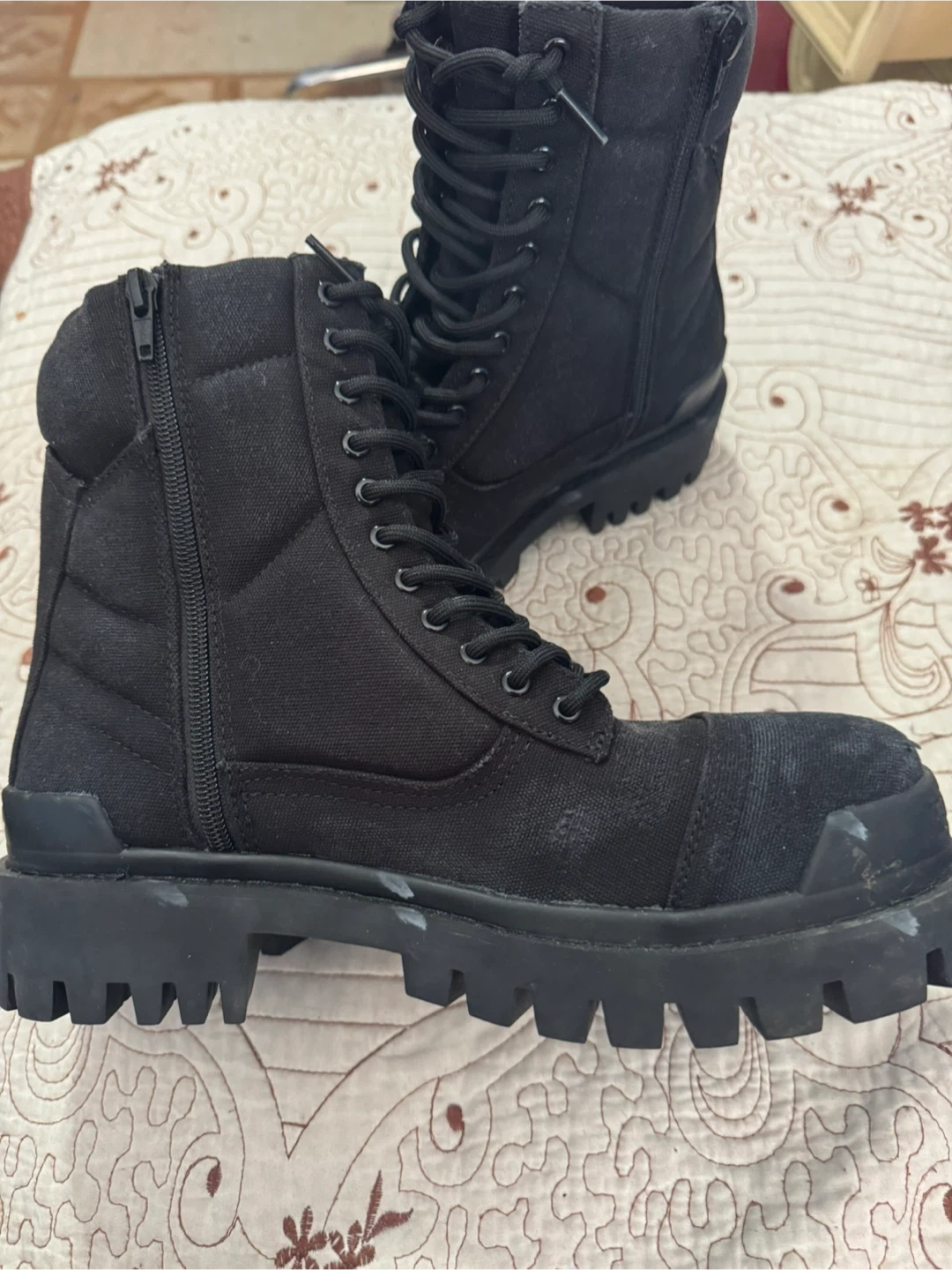 Balenciaga black canvas combat boots. Features a thick lug sole and side zipper for easy on and off. These boots offer a rugged yet stylish look.no box only the boots