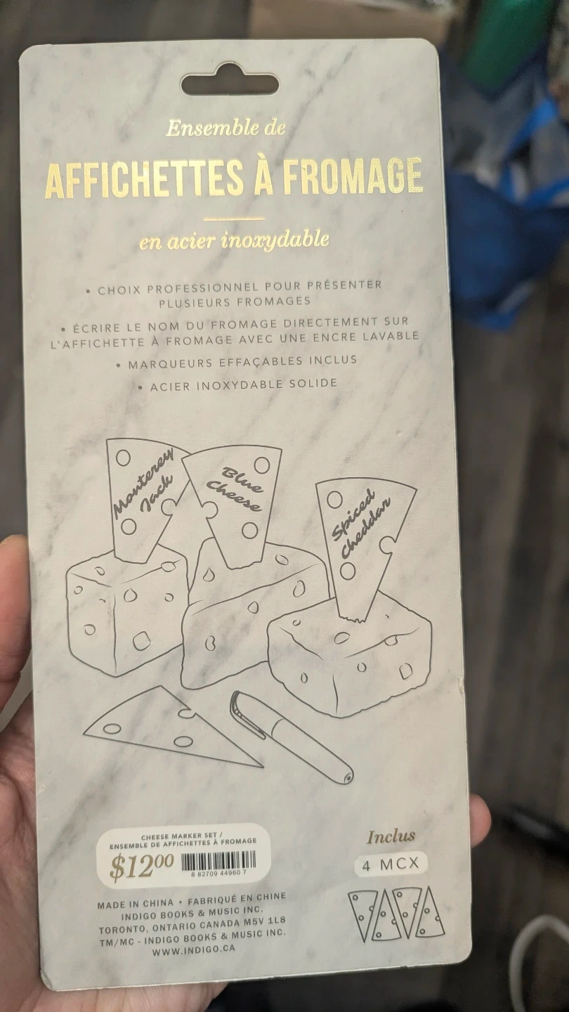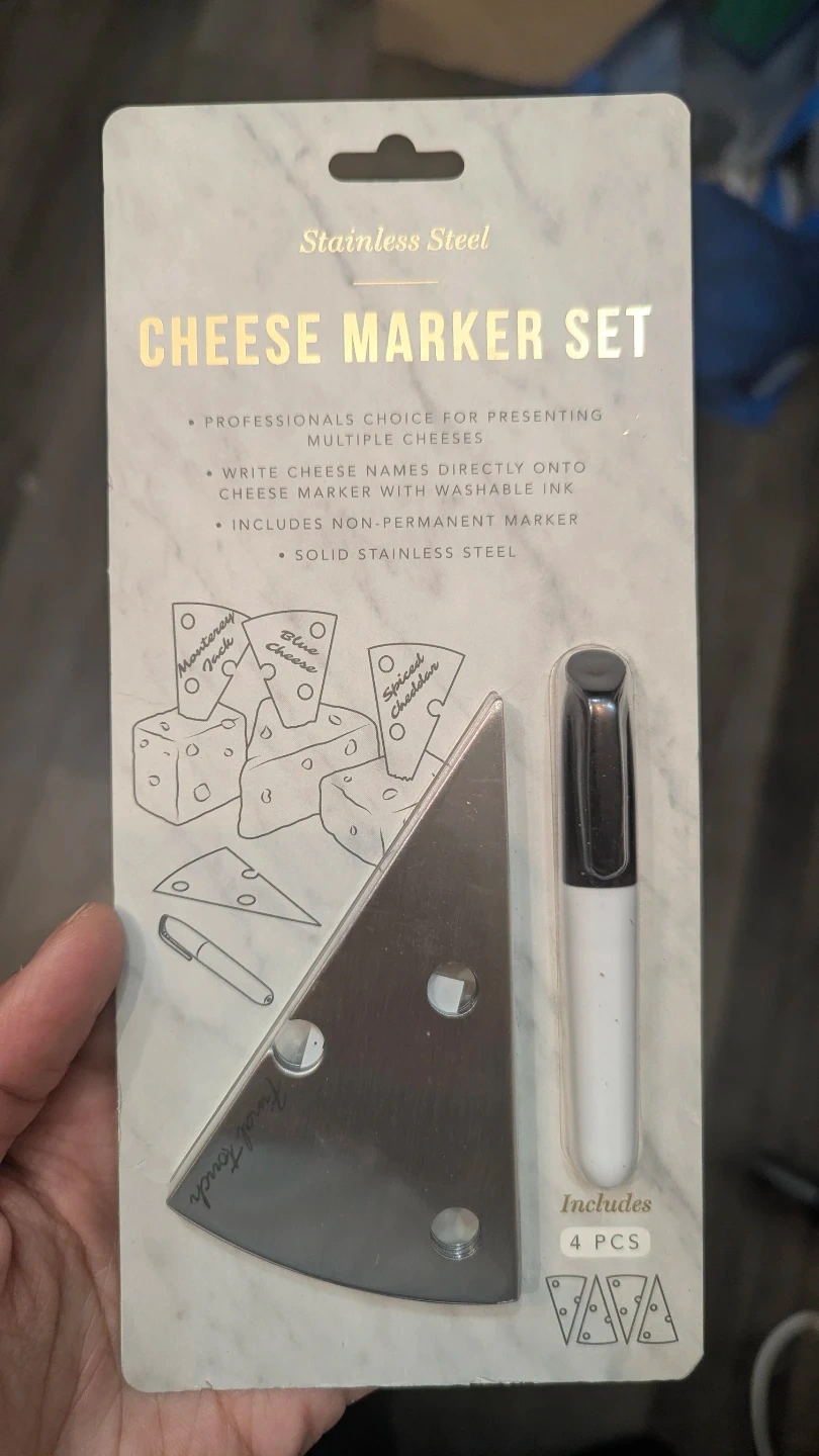 Stainless steel cheese marker set from Final Touch. Includes four cheese-shaped markers and one non-permanent marker with washable ink. Solid stainless steel construction for professional presentation.