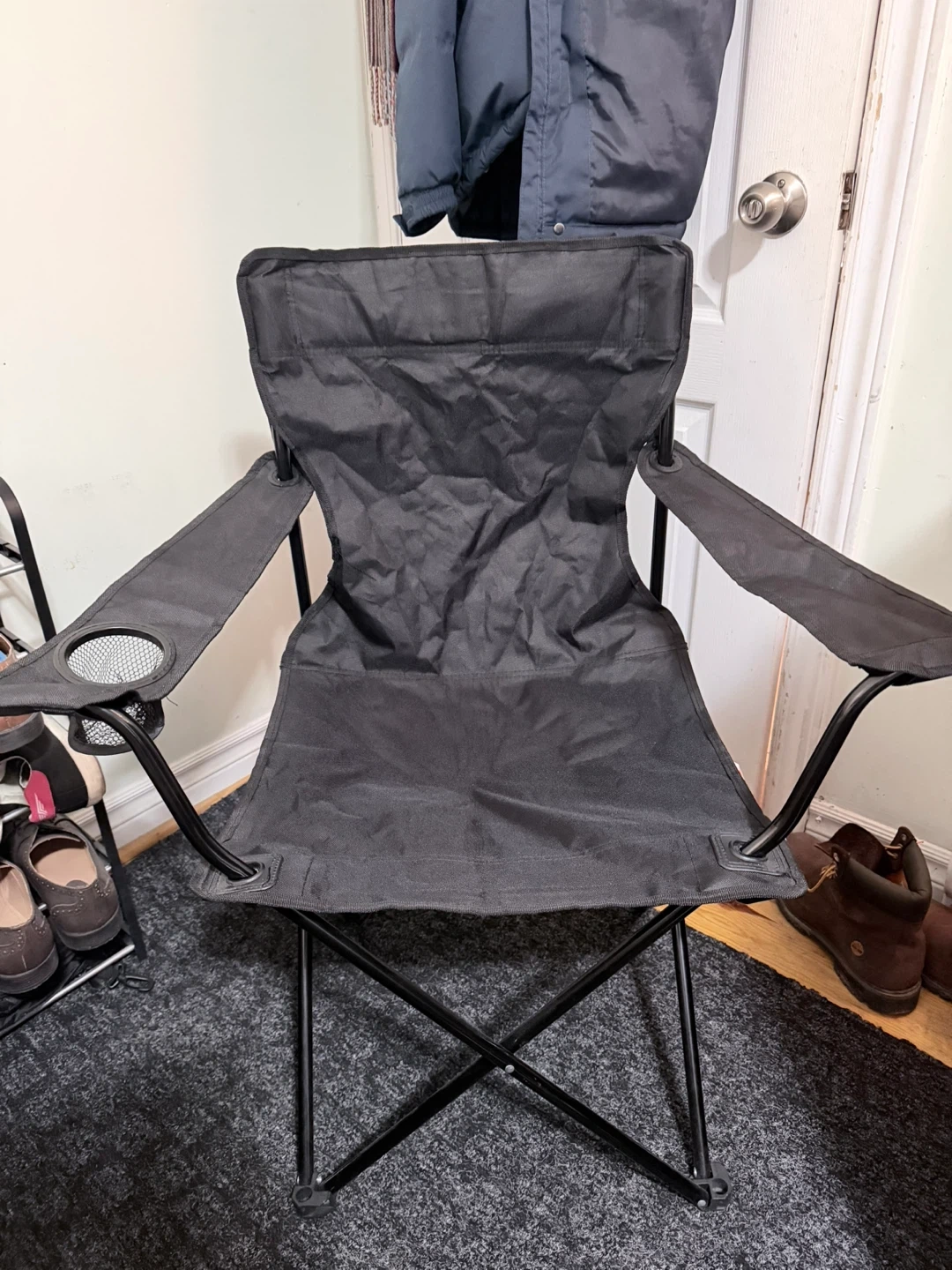 This Ozark Trail camping chair is black and folds for easy transport. It includes a built-in cup holder on the armrest. Simple to set up for any outdoor occasion!