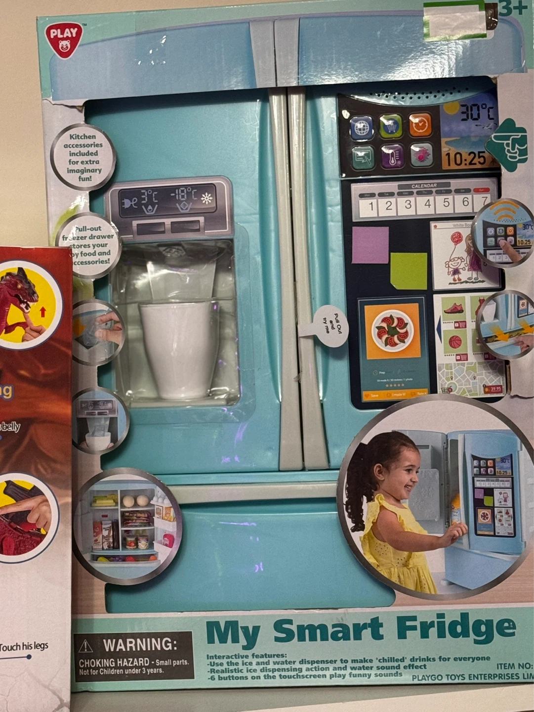 This Playgo My Smart Fridge toy features interactive elements for imaginative play. It includes a pull-out freezer drawer, an ice and water dispenser with realistic sounds, and a touchscreen with six buttons. Kitchen accessories are also included.