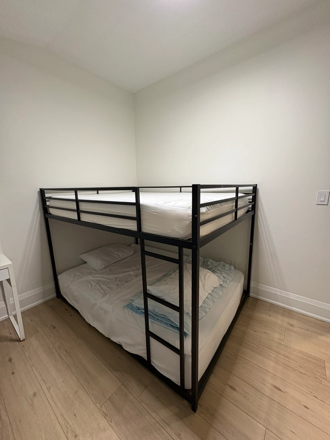 This is a black metal twin bunk bed. It features a sturdy metal frame with a ladder for access. The bunk bed is suitable for two twin-sized mattresses.
