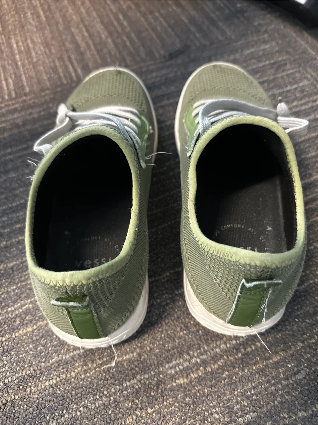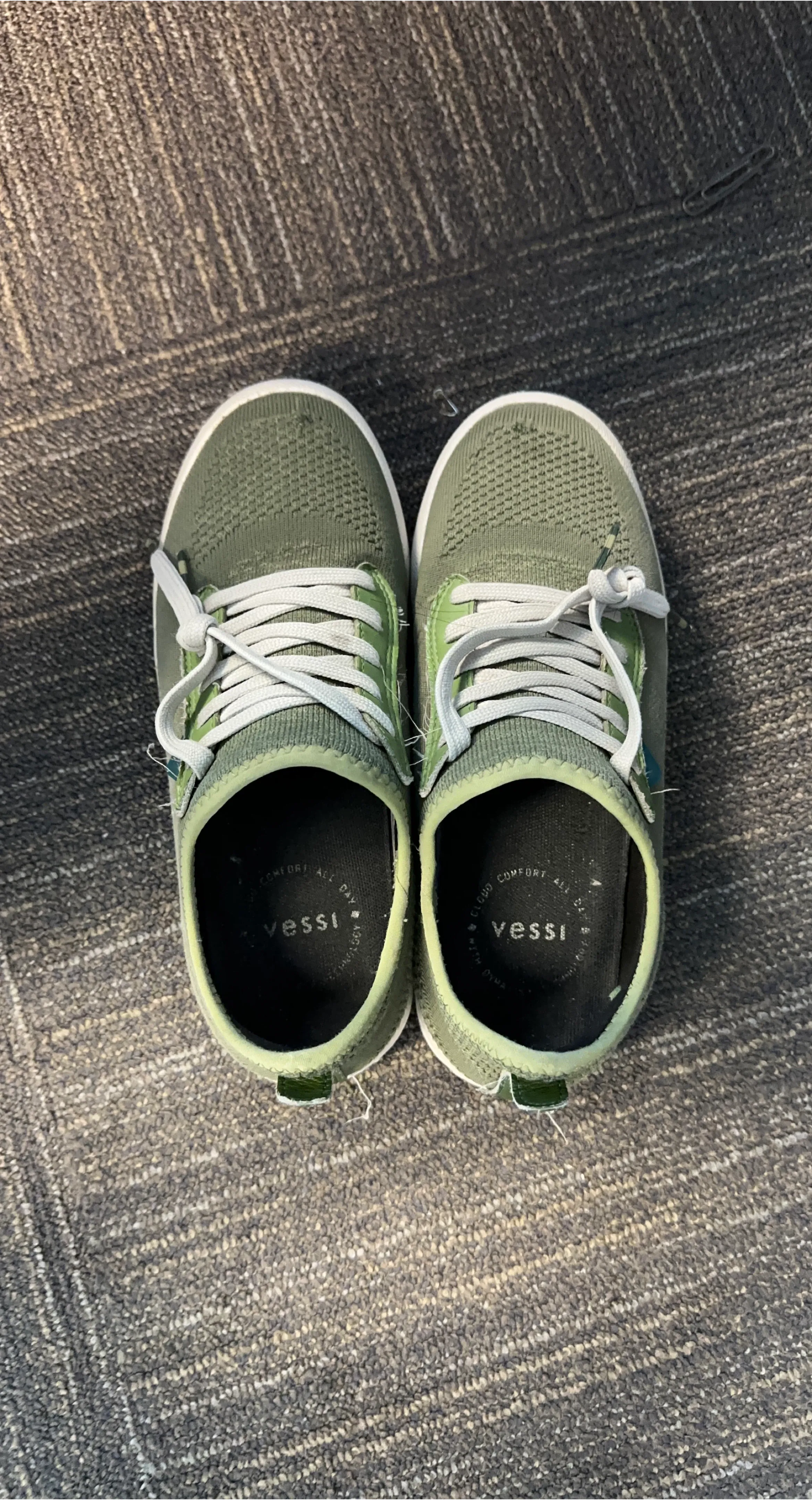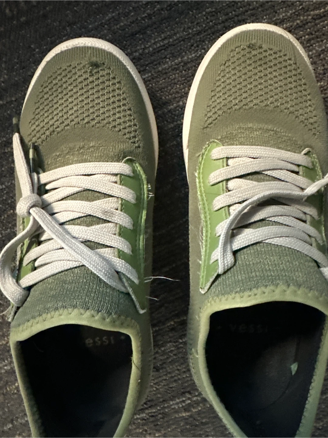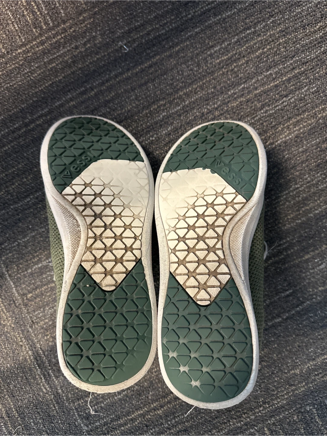 Green knit Vessi shoes. Lightweight and comfortable. Mesh upper and rubber sole.