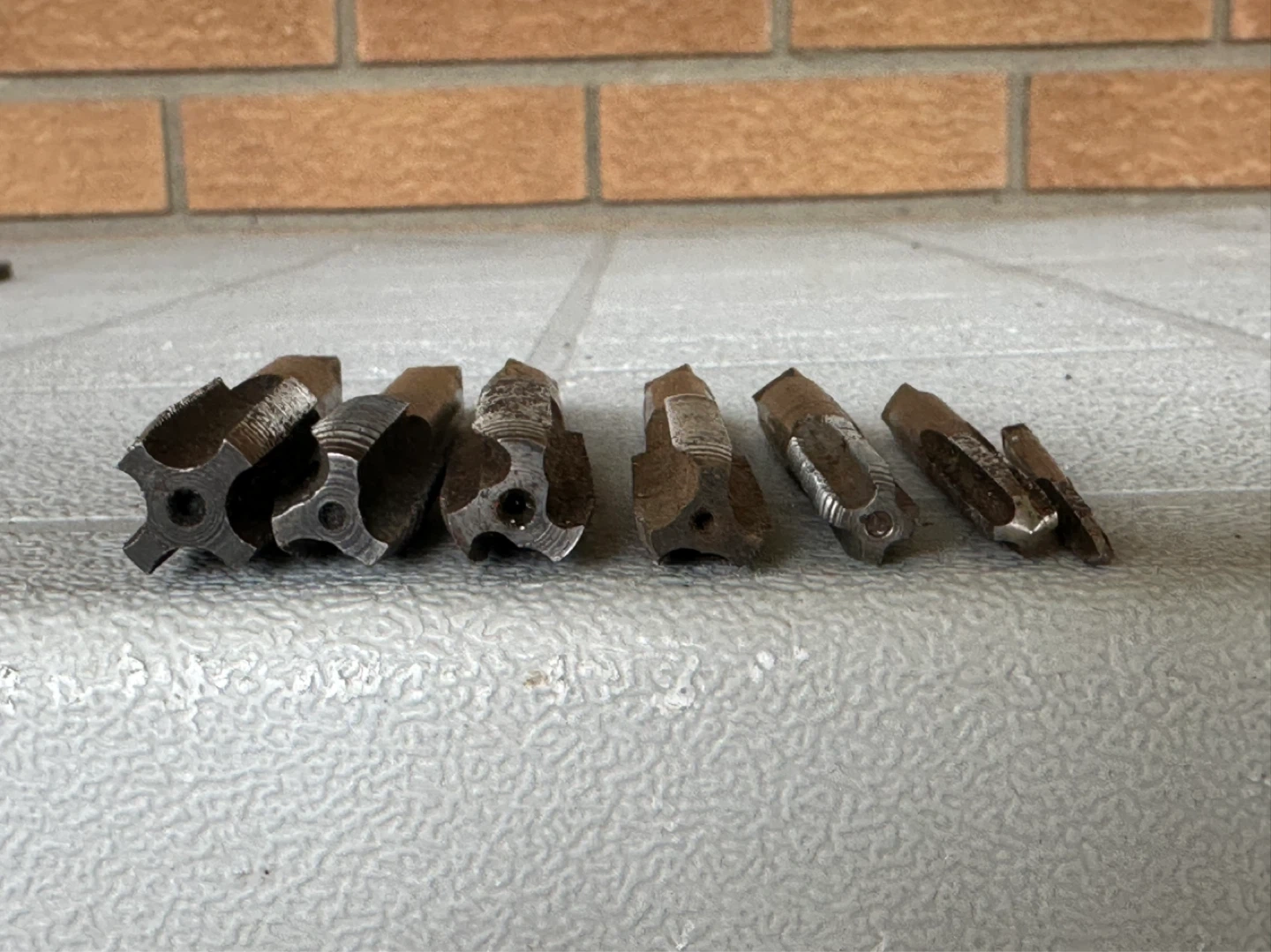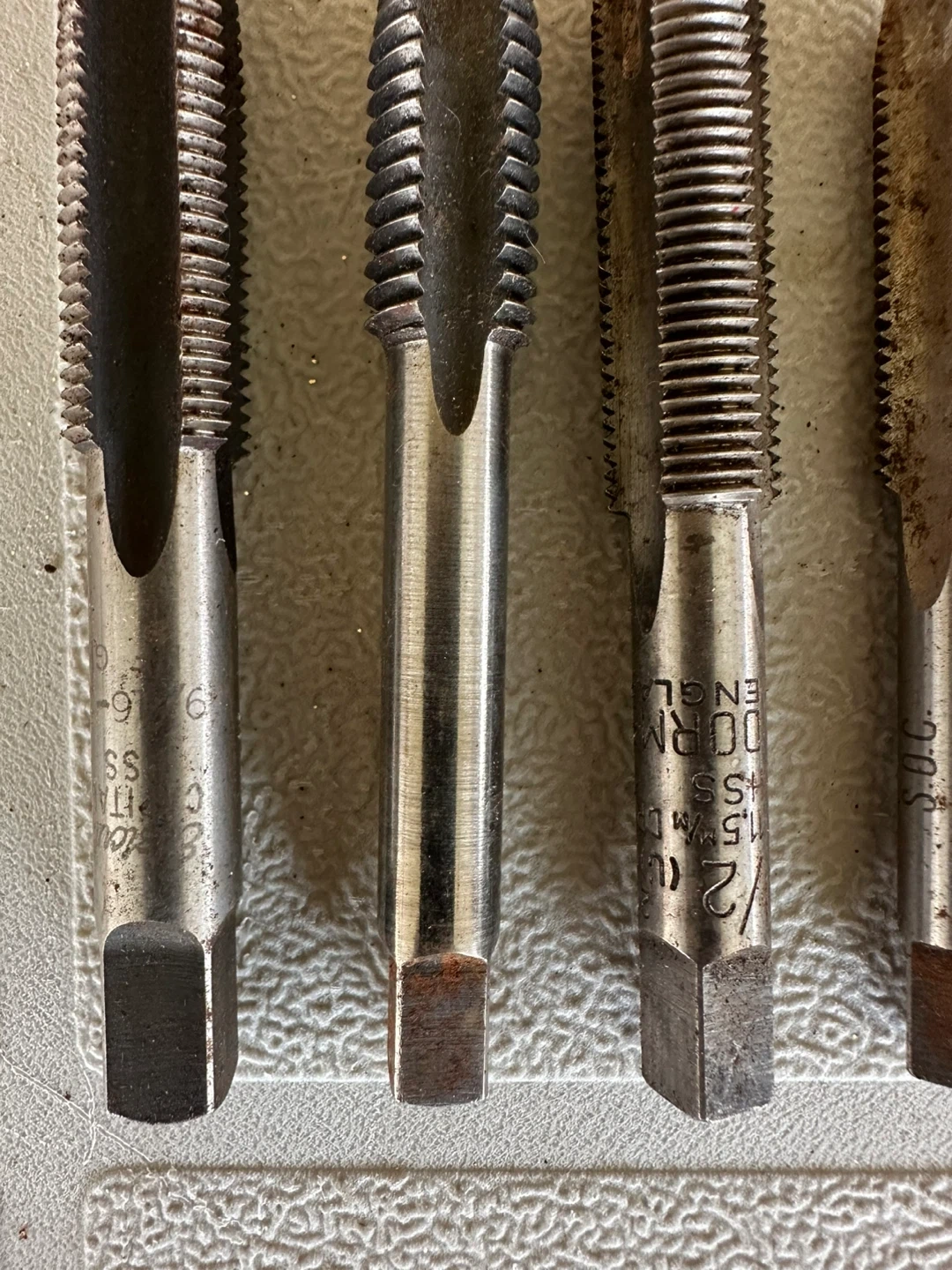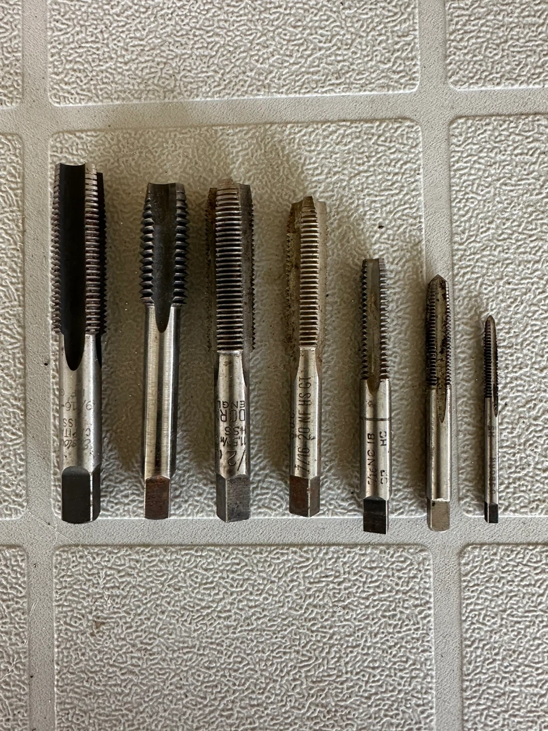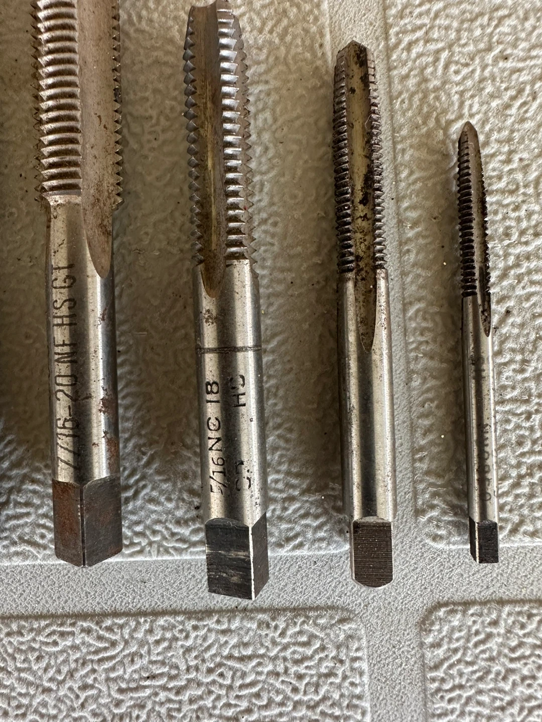 Lot of seven taps and dies. Includes sizes: 7/16-20 NF HS GT, 7/16 NC 1B, 1/2-20 UNF EN, 1/2 1.5MM, and other unreadable sizes. These tools are made of steel.