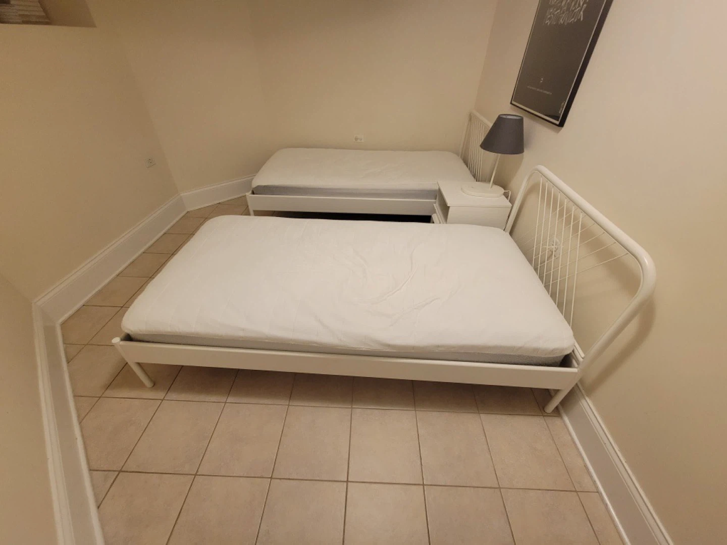 Selling a twin bed frame! It's a simple white metal frame. Perfect for a small room or guest room. In good condition and ready for a new home.There are two beds, take all $50.