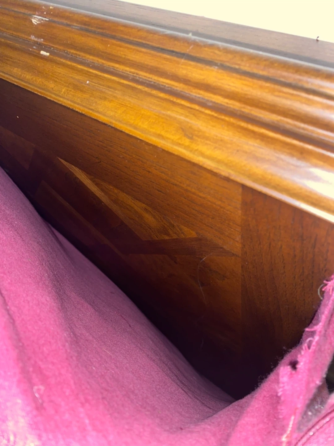This is a lovely wooden dining table, suitable for seating eight people. It comes with eight matching chairs upholstered in a plush fabric. The table has a decorative inlay pattern and includes a fabric runner. It's a classic set for family dinners! Which comes with 2 extensions