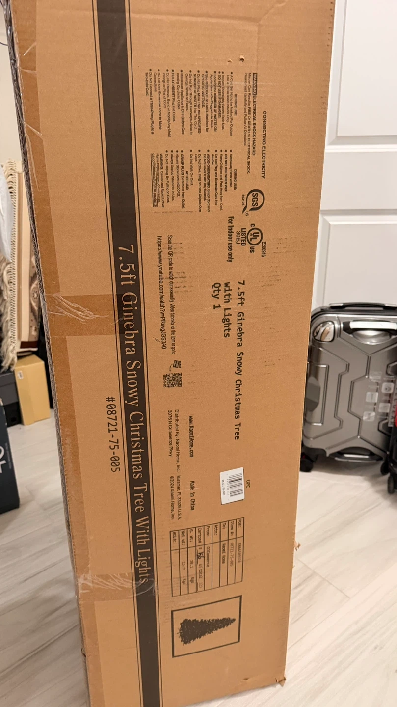 This is a 7.5ft Ginebra Snowy Christmas Tree, complete with lights. It comes with the original box. It's perfect for creating a festive holiday atmosphere! Free with toys and Santa clause. One season used like new.
