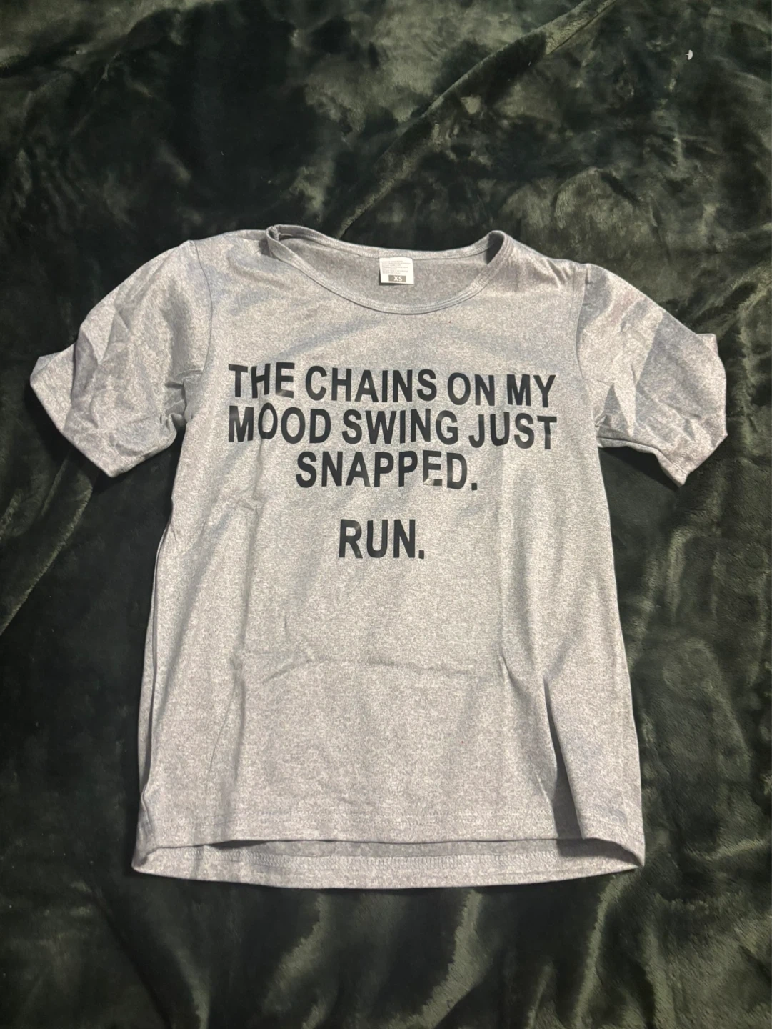 This is a grey t-shirt with the text "THE CHAINS ON MY MOOD SWING JUST SNAPPED. RUN." printed on the front. It's a size XS. Made of a soft, breathable material. Perfect for casual wear or a good laugh!