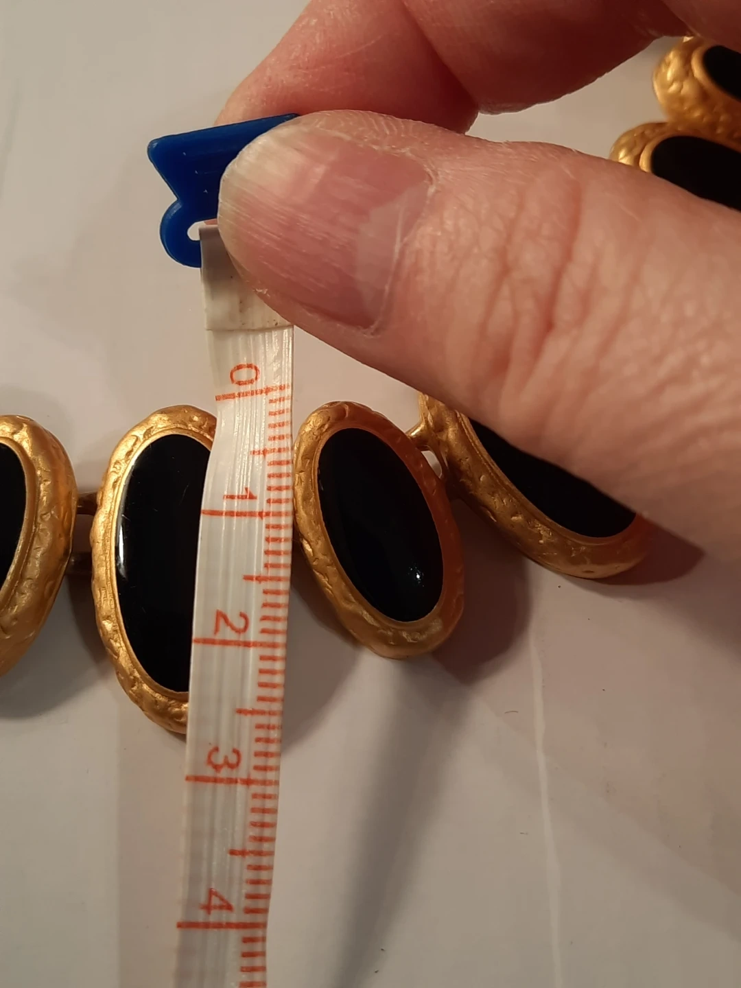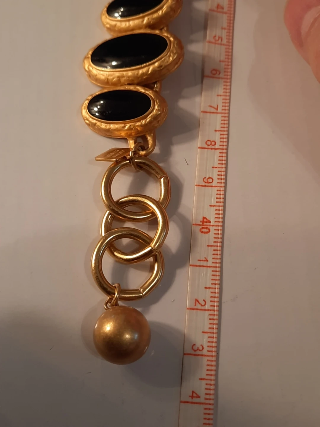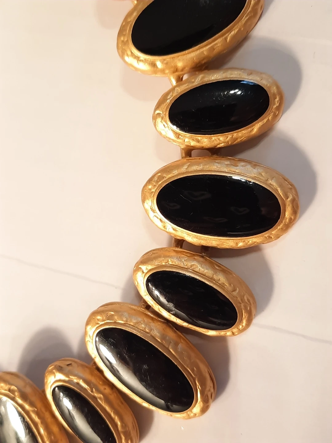 Gold tone necklace with black oval inlays. Features a toggle clasp closure. Necklace is approximately 18 inches long.