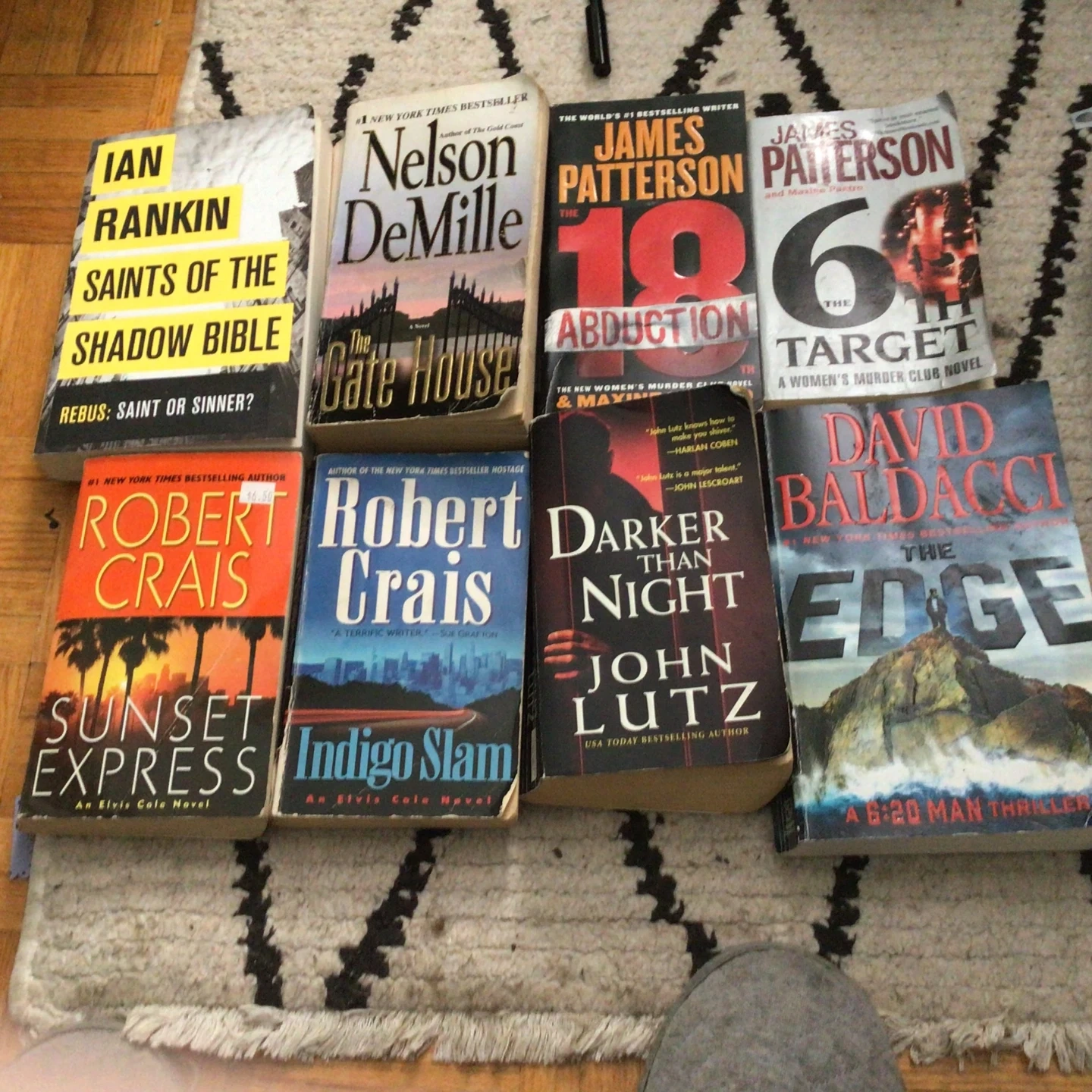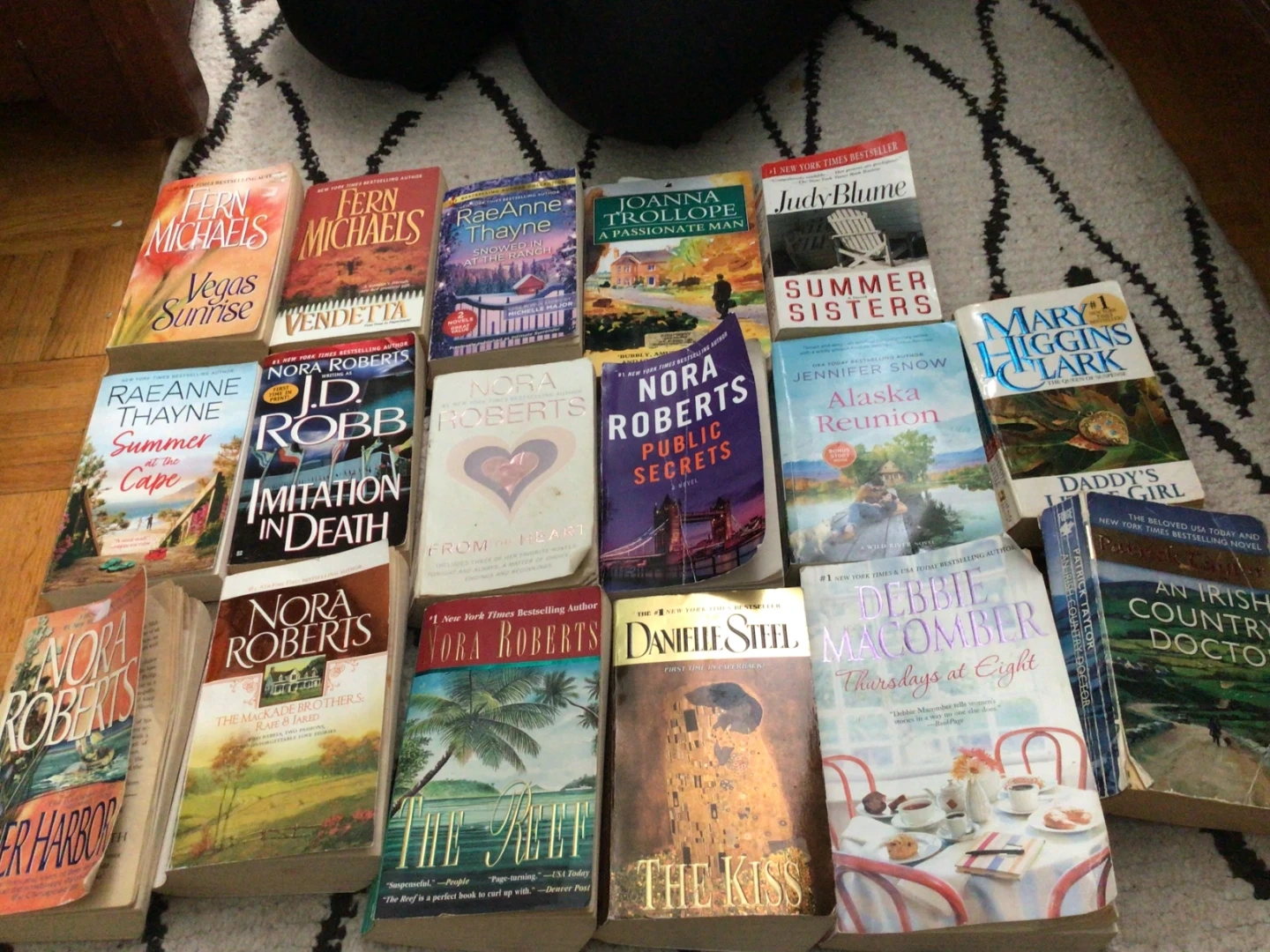 Collection of popular paperback novels by authors like Nora Roberts, Fern Michaels, and James Patterson. Mix of romance, mystery, and thriller genres. Books are in good readable condition.