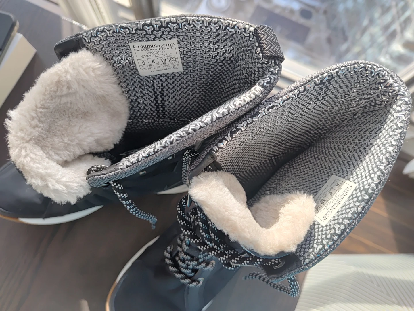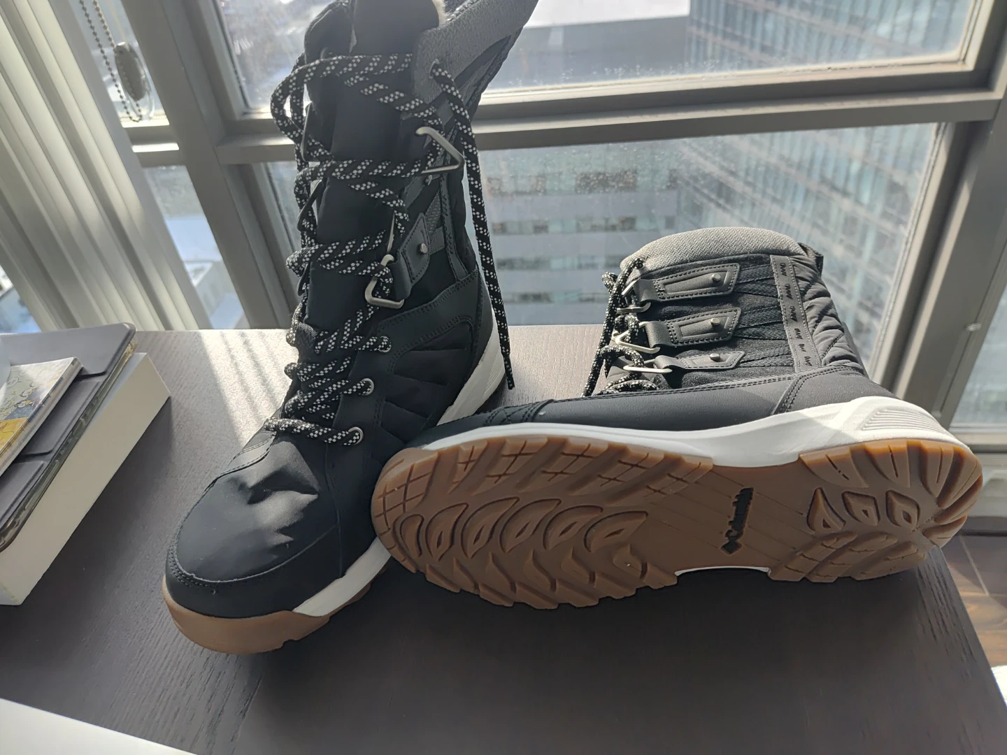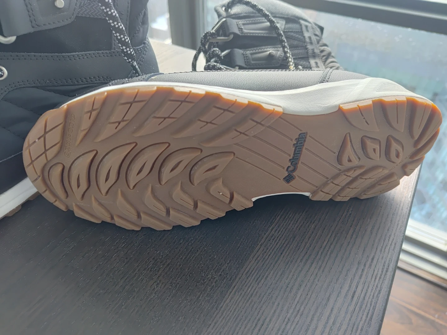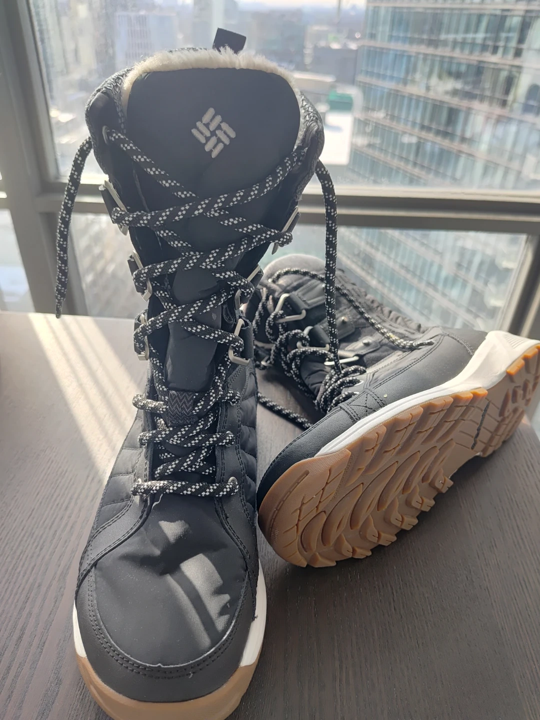 Columbia women's snow boots in black and tan. These boots are insulated and waterproof, designed for cold weather. They're a size 8 with a secure lace-up closure. Perfect for keeping your feet warm and dry during winter activities!