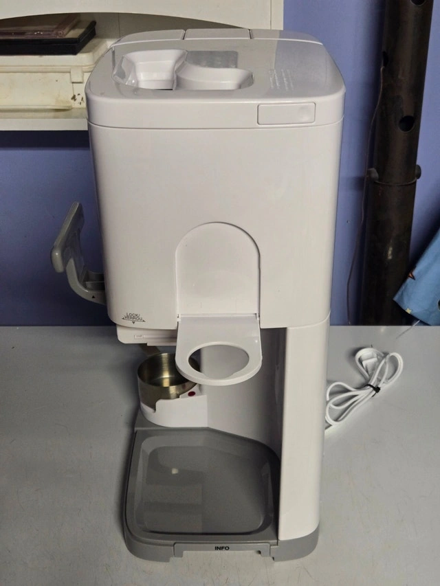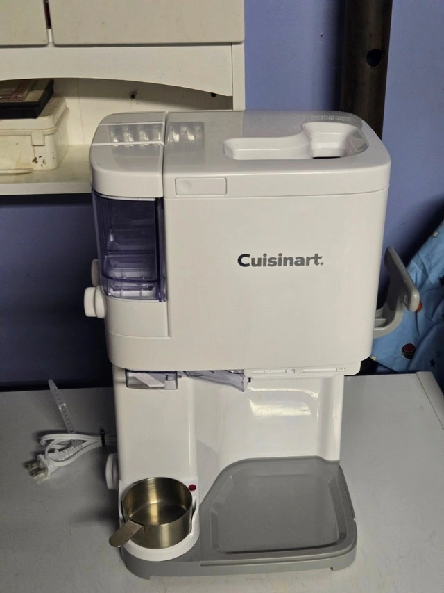 Cuisinart soft serve ice cream machine in good working condition. Makes smooth, creamy soft ice cream at home, perfect for summer treats. There is a small crack on the side of the container (shown in photo), but it does not affect performance or function. From my experience, the texture and amount of cream determine how soft or firm the ice cream turns out; it's best not to add too much for the right consistency. Key Features: Trusted Cuisinart brand, makes soft serve ice cream, frozen yogurt, and sorbet. Includes built-in cone holder, built-in syrup meltor, dispensing handle, and mixing container. Easy to use and clean. Tested and working properly. Minor cosmetic crack on clear side panel (no leaking, no performance issue).