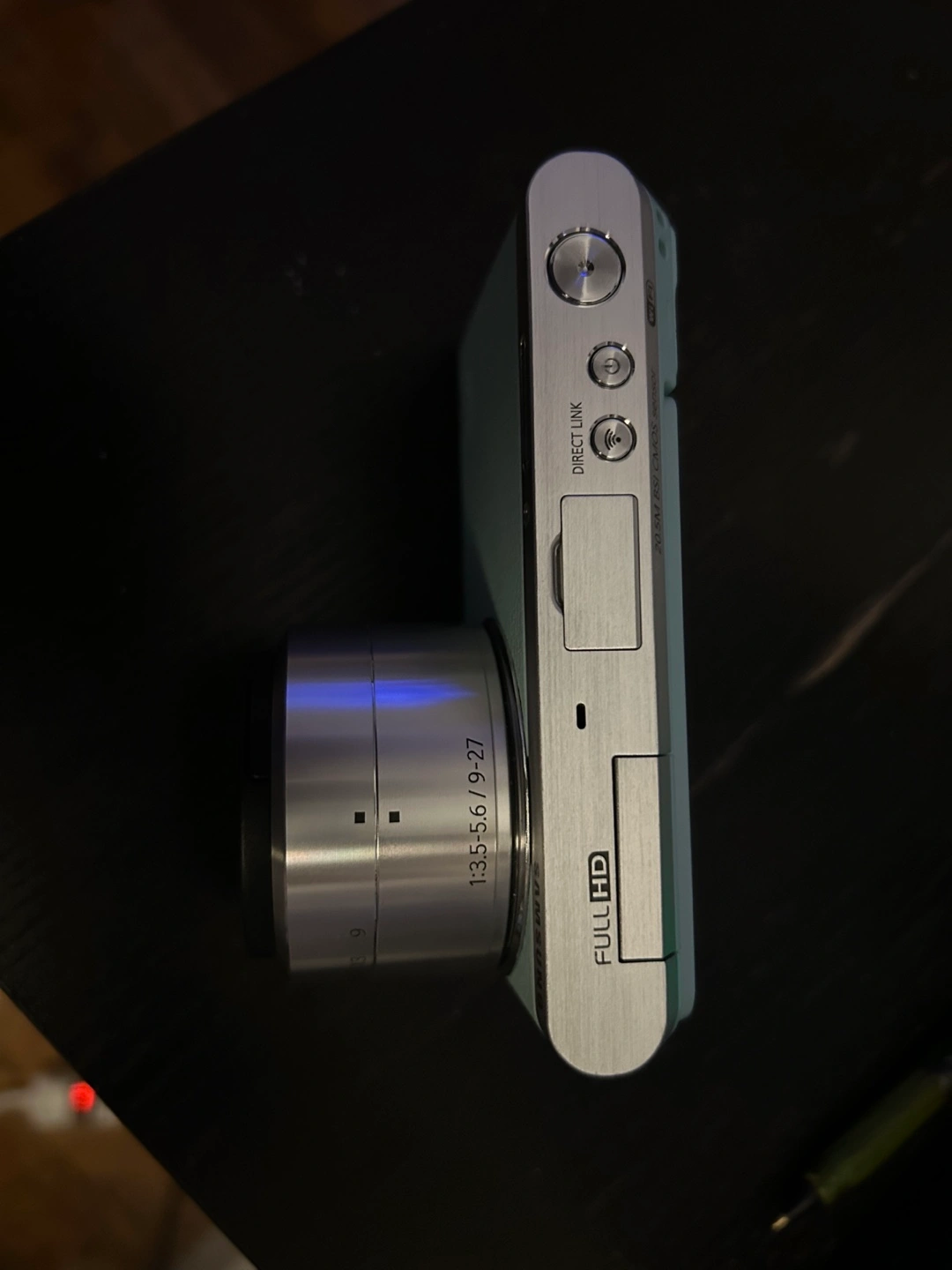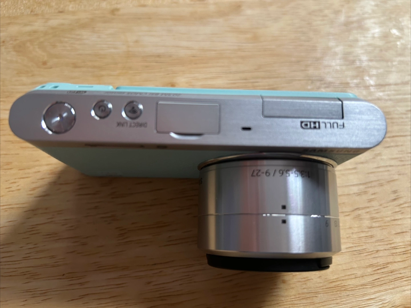 A compact digital camera. Features a mint-green body and a silver lens. Buttons along the top and back.