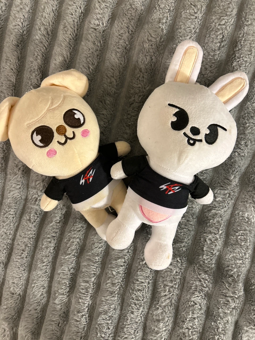 Two plush dolls are included, one looks like a dog and the other a rabbit. Both are wearing a SKZ logo shirt. These are soft and cuddly stuffed toys perfect for fans who do not want to spend much on official ones.