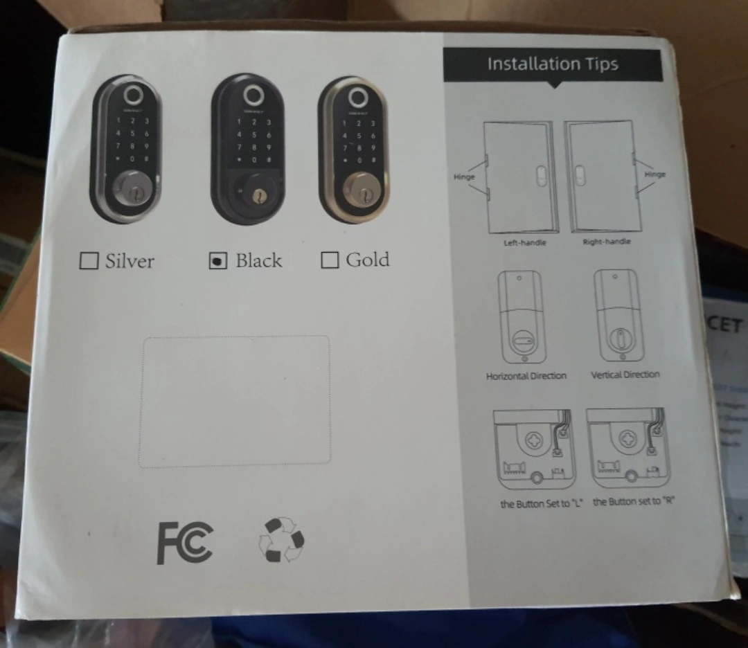 The lock includes a micro USB back-up and supports IC cards and fingerprint access. A screwdriver and manual are included.