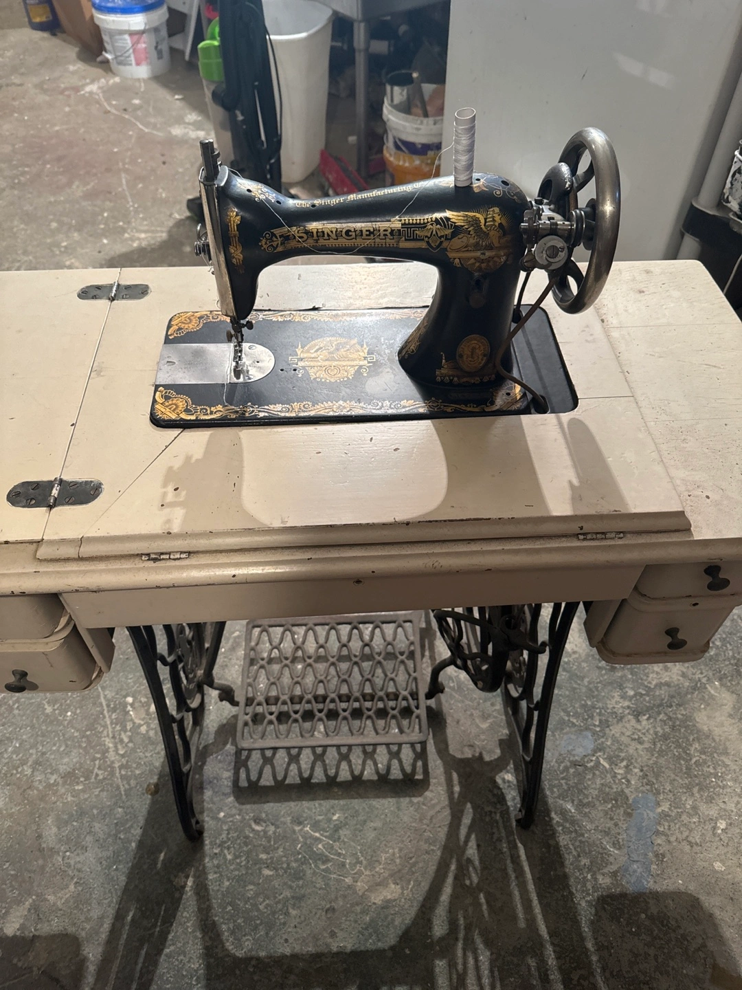 This is a vintage Singer sewing machine set in a table. It features a decorative black and gold sewing machine head. The table has multiple drawers and a pedal for operation. This piece would be a great addition for anyone interested in antique sewing equipment.