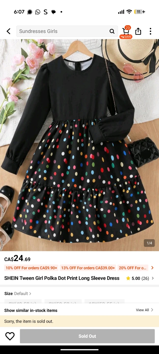 A black long-sleeved dress with a colourful polka dot print on the skirt. It features a tiered ruffled hem. Made for girls.