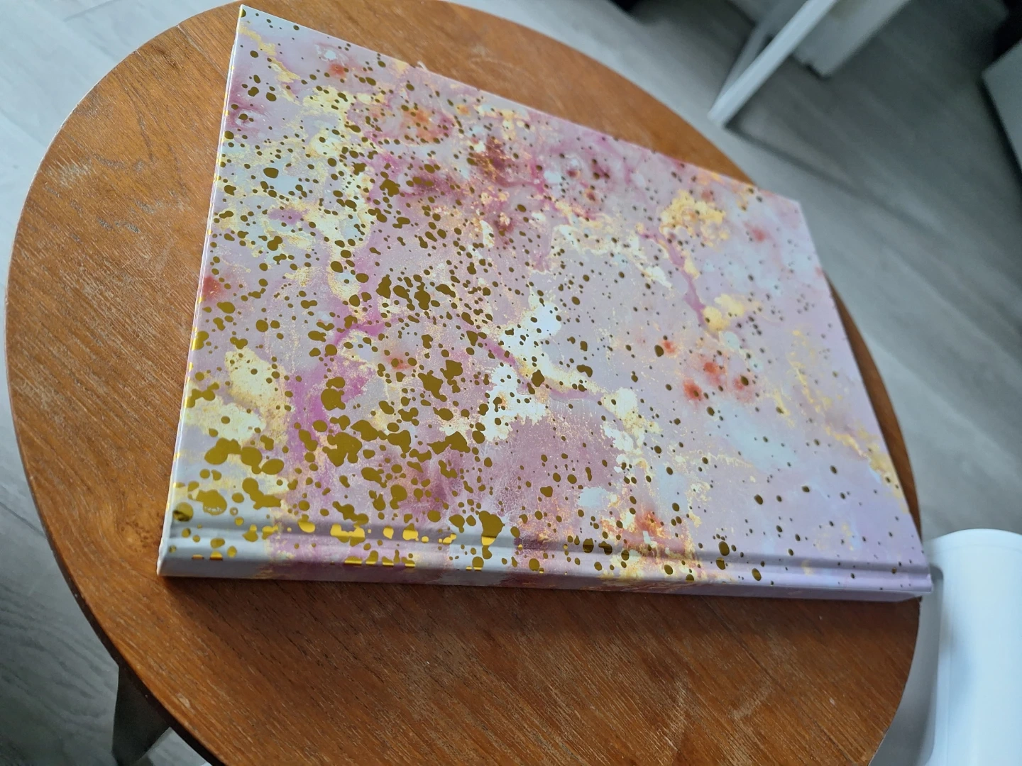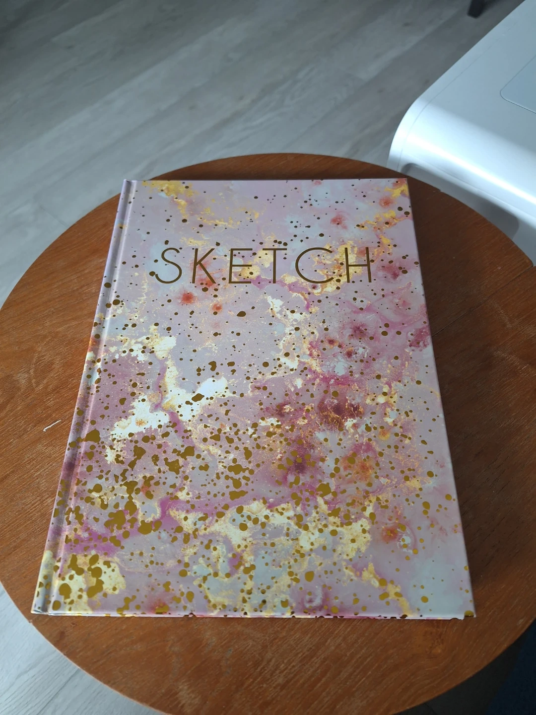 A lovely sketchbook perfect for your creative projects. It has a stylish marble and gold splatter design on the cover. The pages are blank and ready for your art!
