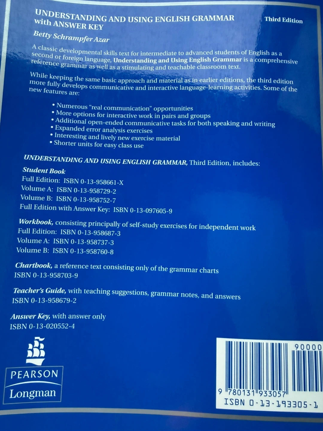 Three books to study English. One is the dictionary! One textbook is the Third Edition of Understanding and Using English Grammar. It's a classic developmental text for students of English as a second or foreign language. Includes the answer key for exercises. Third Edition.
