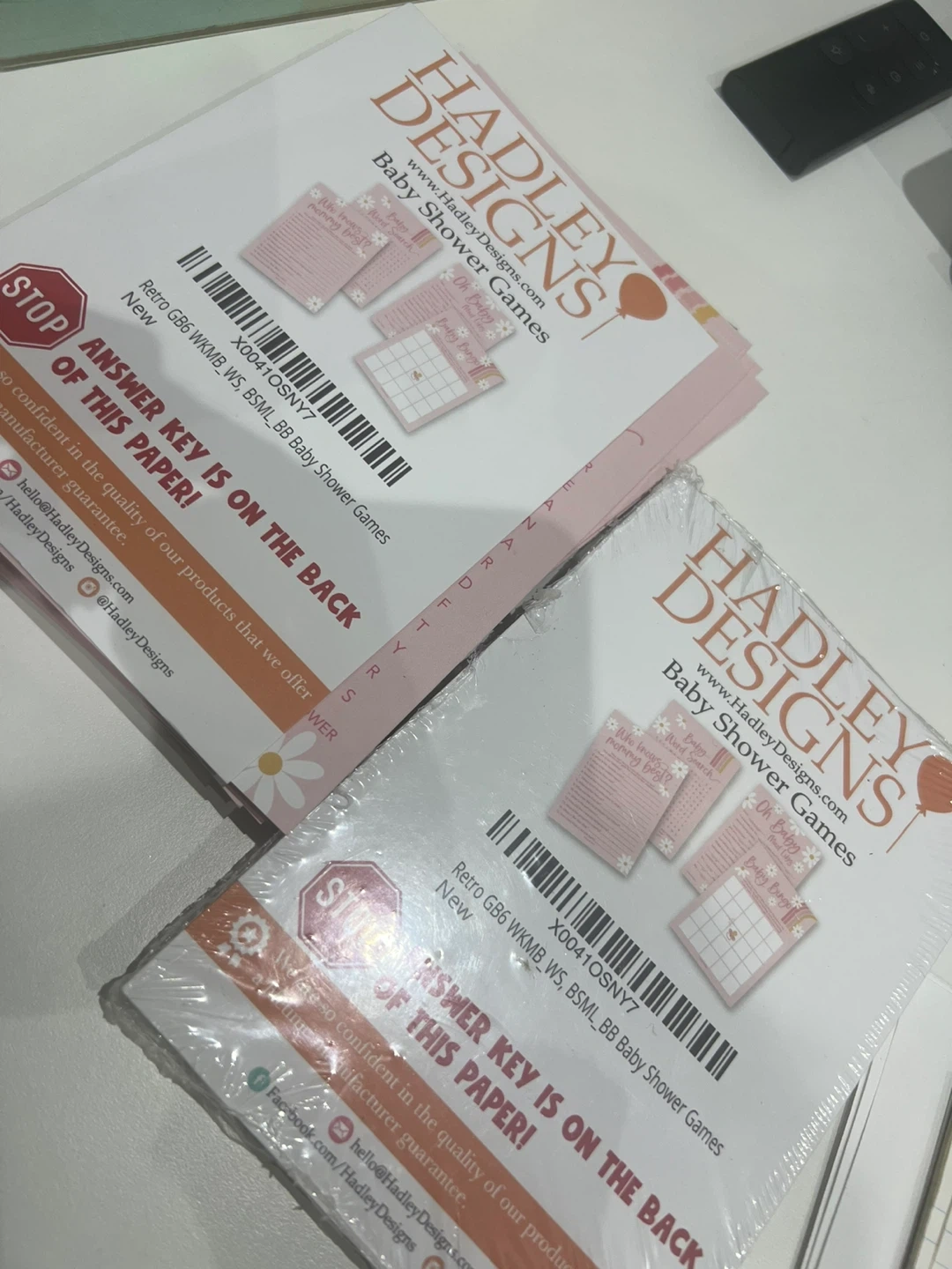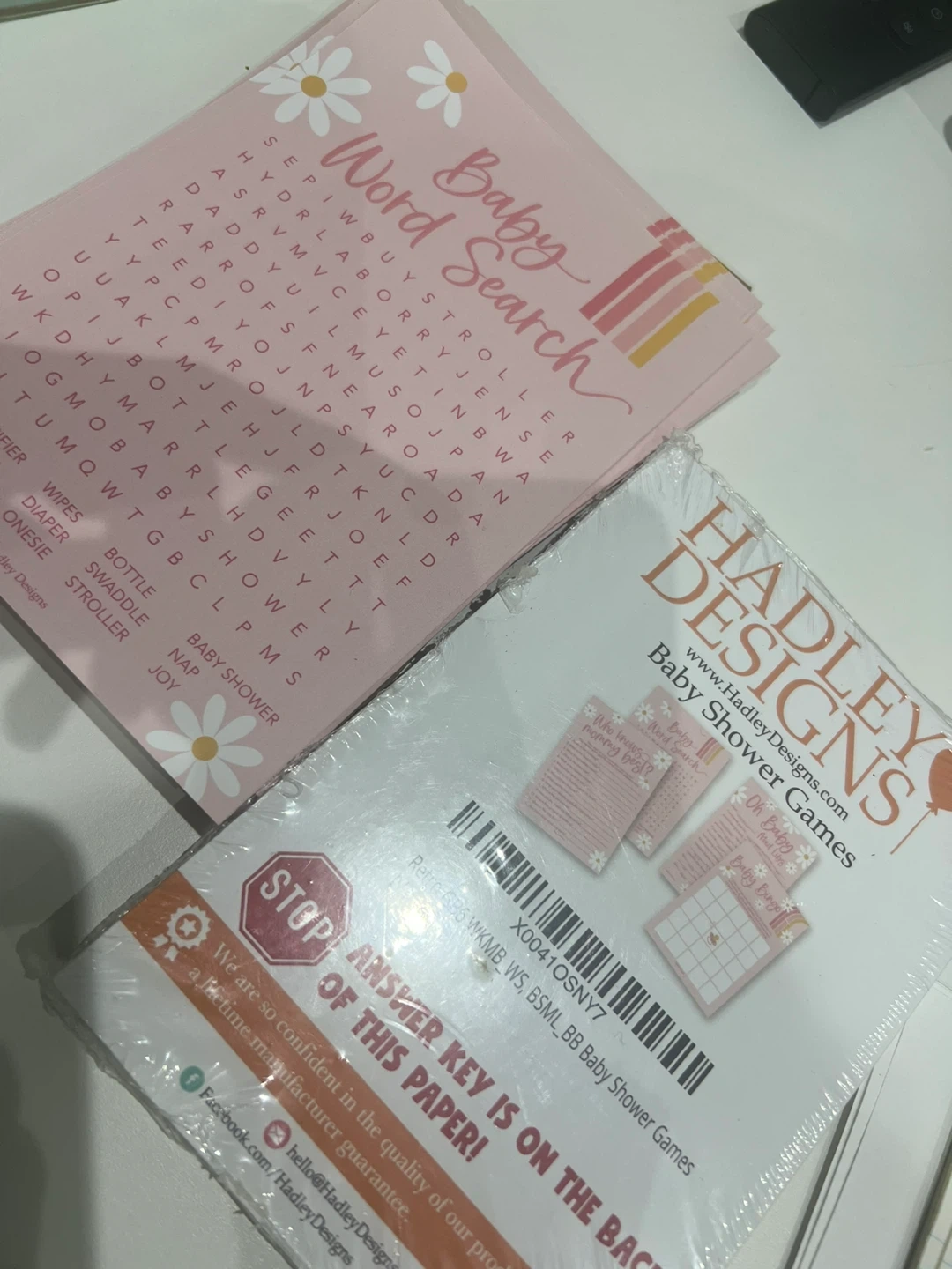 New Hadley Designs baby shower games set! Has 4 fun games: Baby Word Search, Baby Bingo, Who Knows Mommy Best, and Oh Baby! Mad Libs. Pink with cute daisy and rainbow designs.