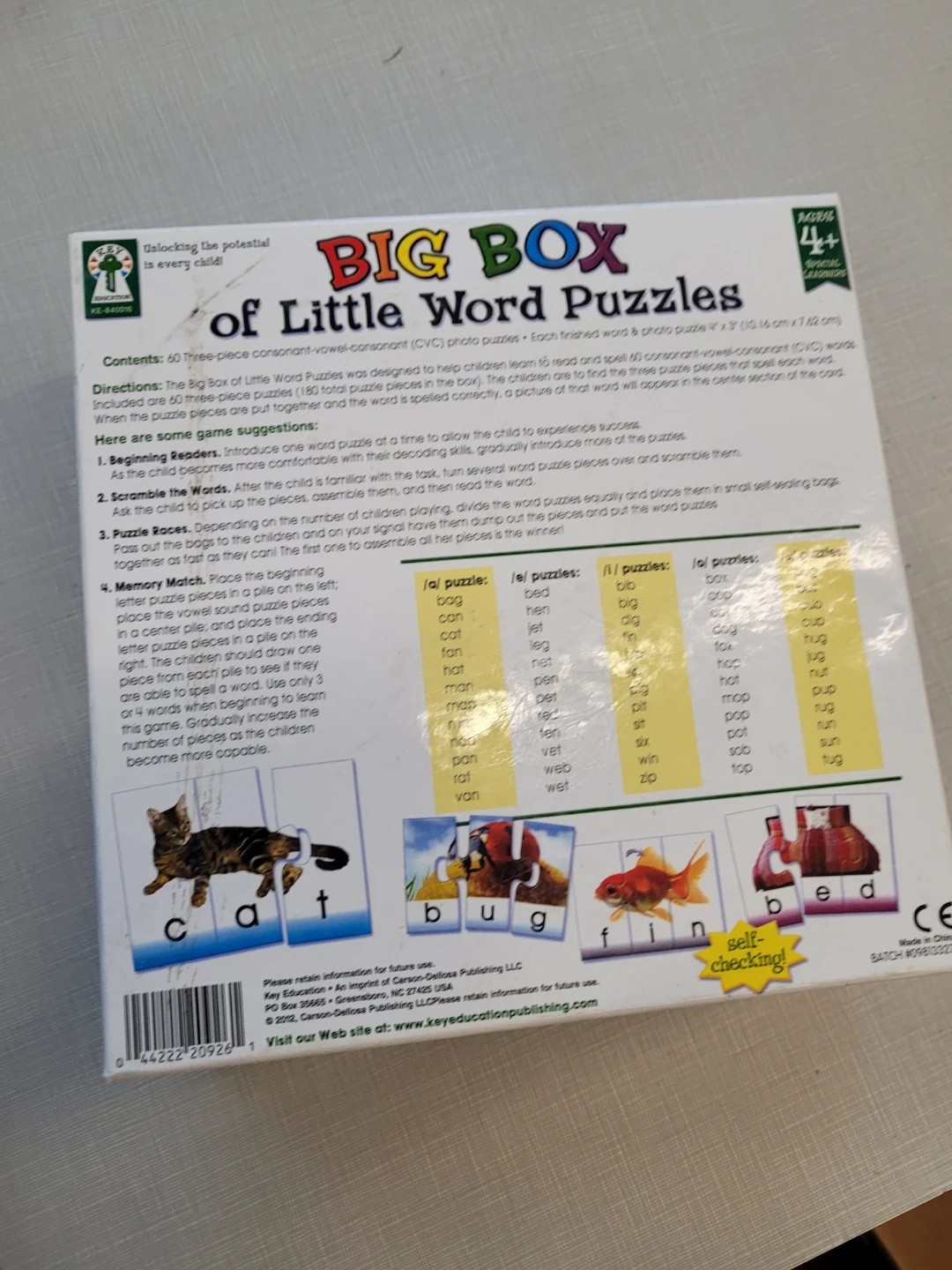 I'm selling a Big Box of Little Word Puzzles! It's designed for ages 4+. This set includes 60 three-piece consonant-vowel-consonant (CVC) photo puzzles. Each finished word & photo puzzle is 4" x 3" (10.16 cm x 7.62 cm). A fun way to learn to identify initial, medial, and final consonant sounds
