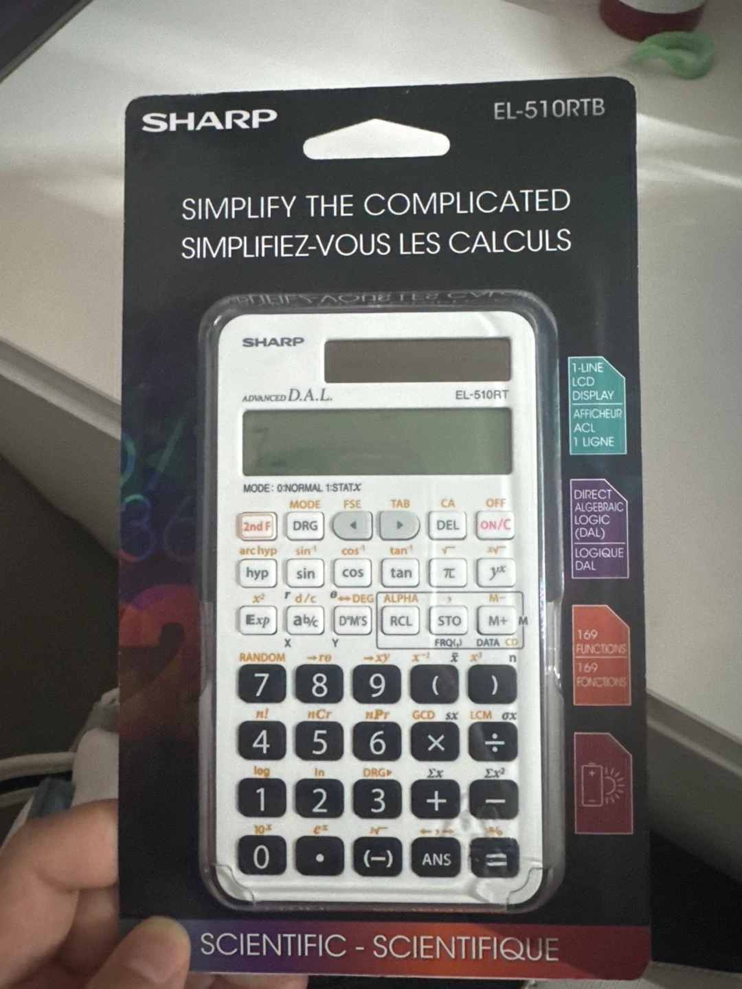 Sharp scientific calculator, model EL-510RTB. It features a 1-line LCD display and advanced D.A.L. logic. This calculator comes with 169 functions and is powered by batteries.