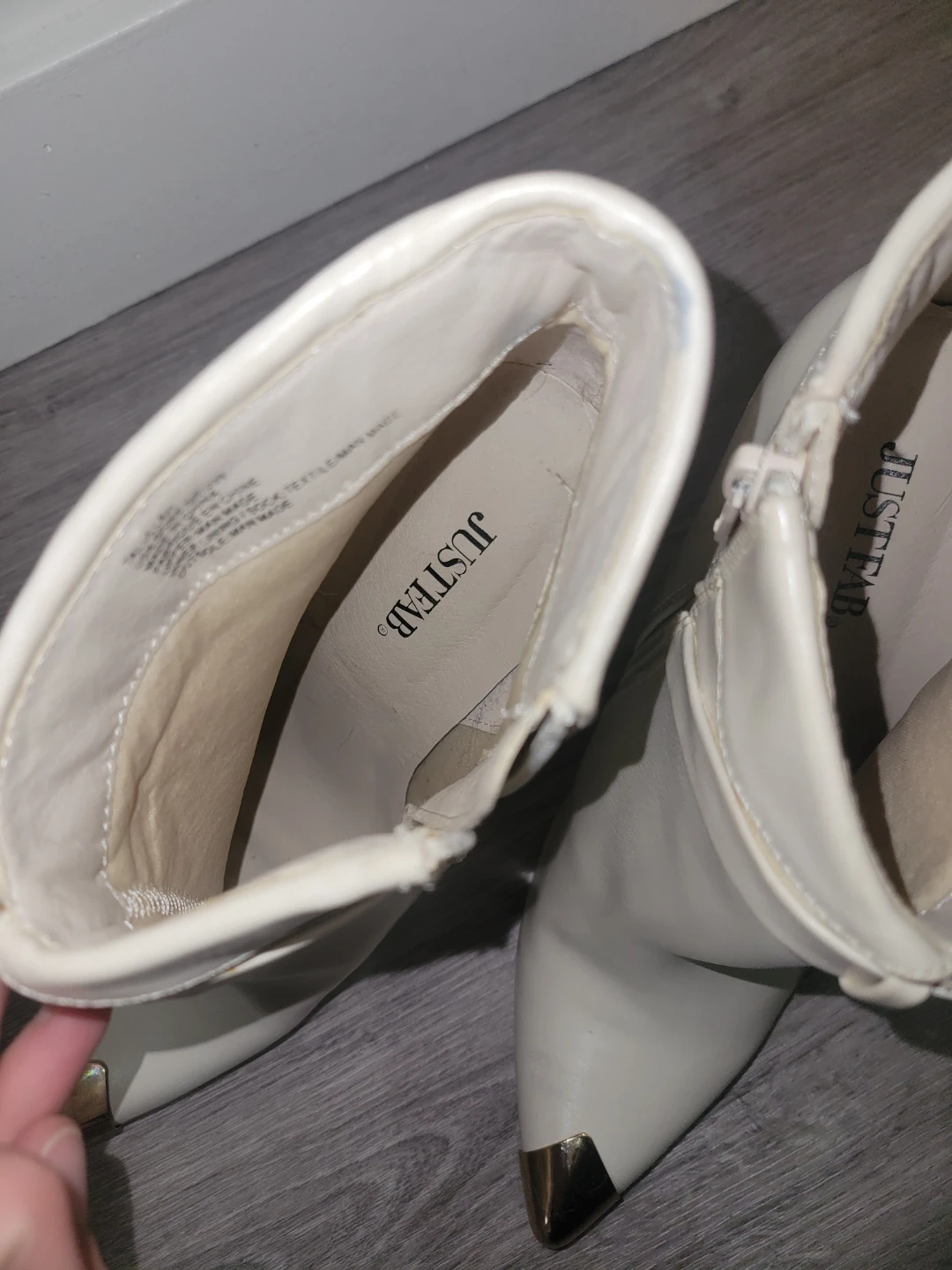 Stylish white ankle strap heels featuring a gold toe cap. These shoes have a side zipper for easy wear. They're great for dressing up any outfit!