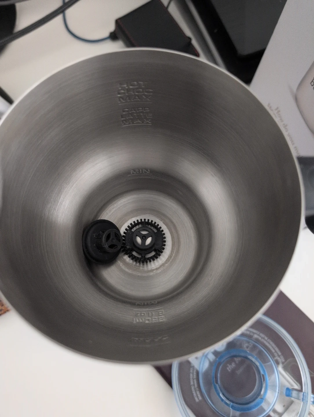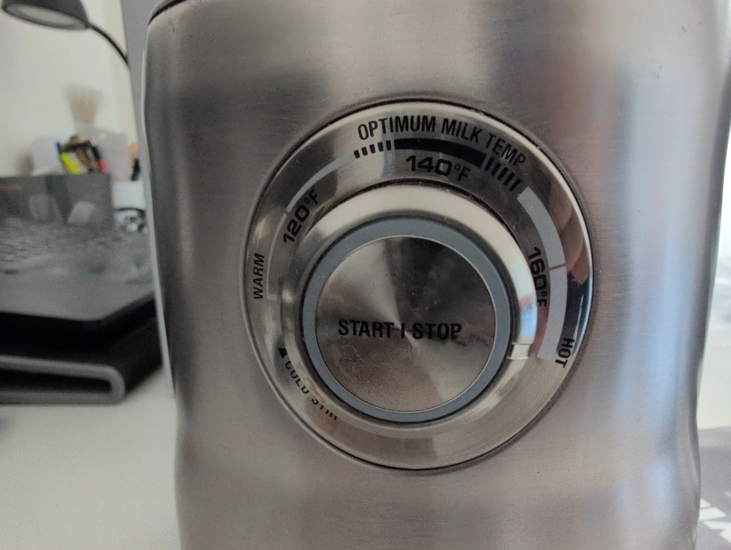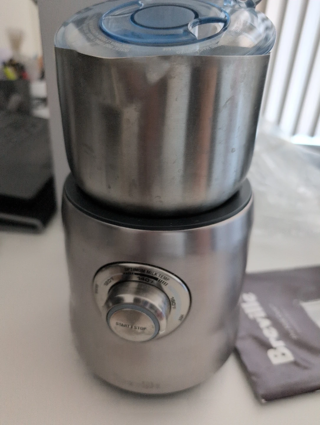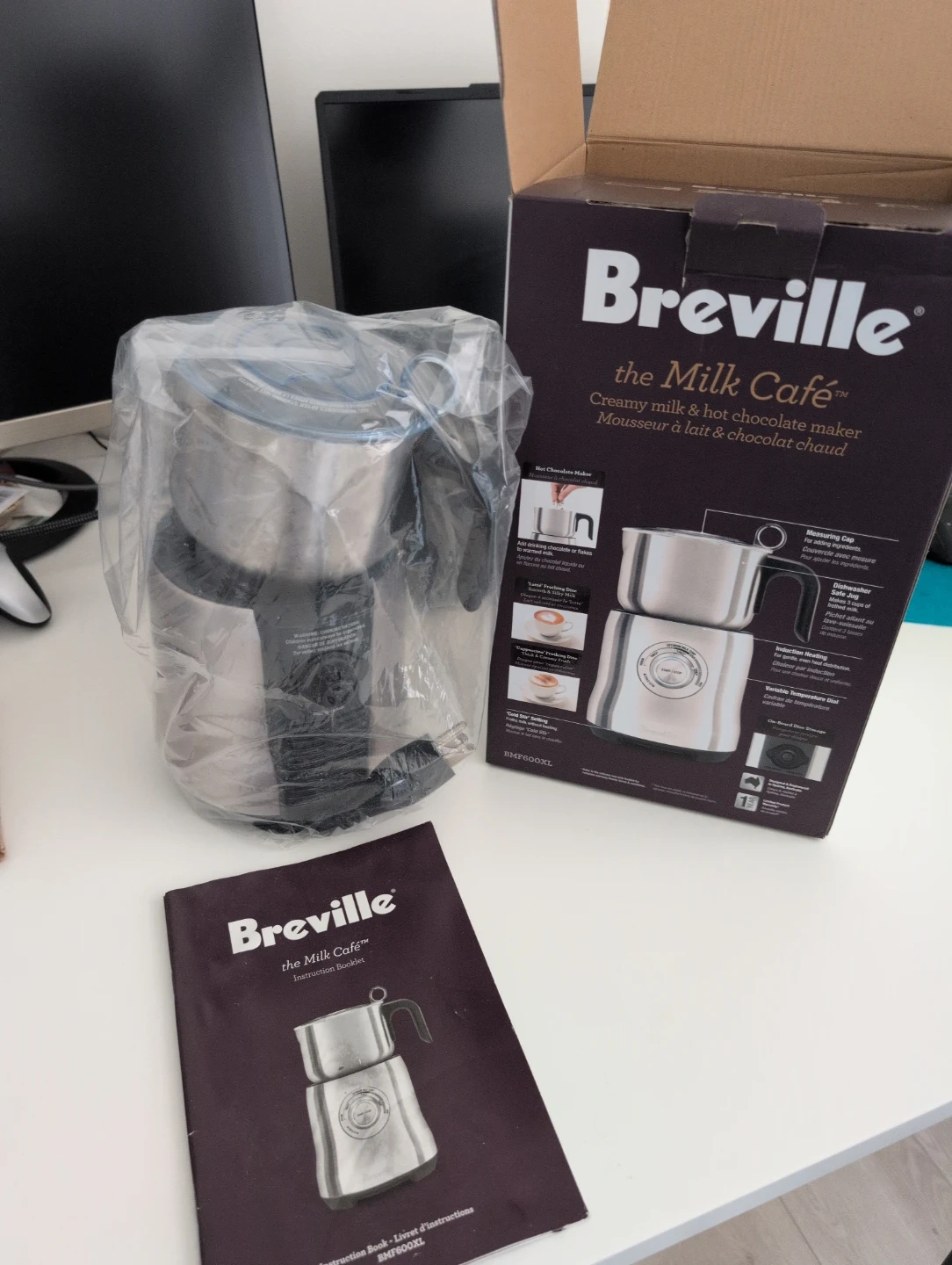 This Breville Milk Cafe makes creamy milk and hot chocolate. It features a variable temperature dial from warm to hot. Includes the milk frothing discs (latte or cappuccino )and original box.