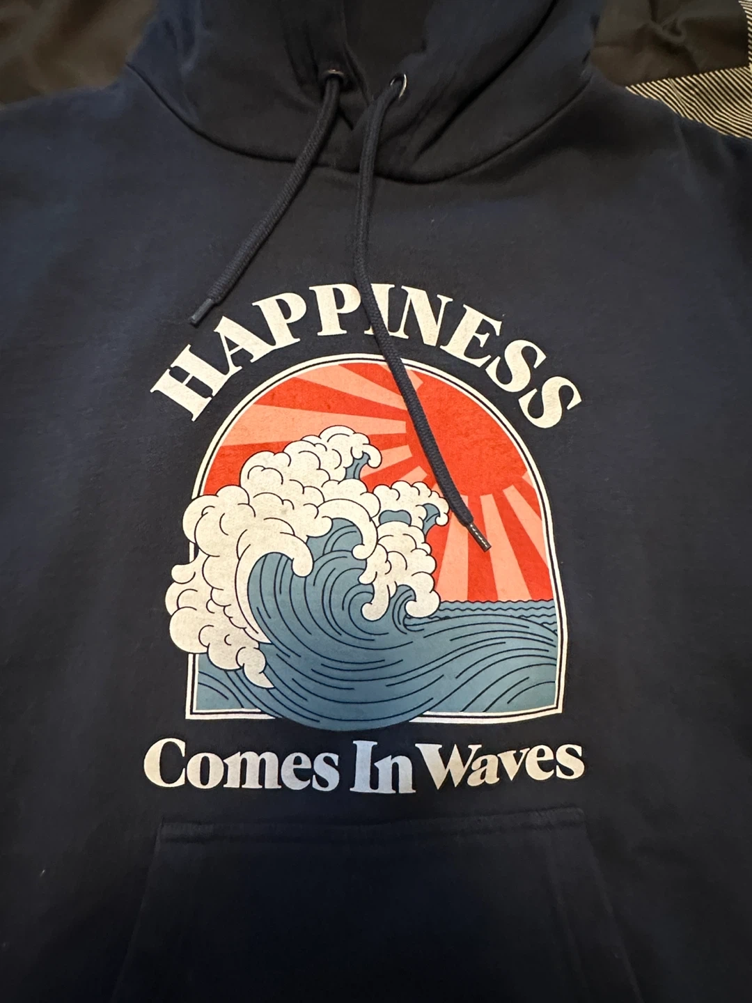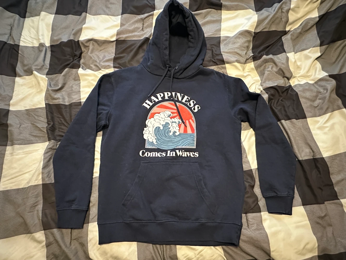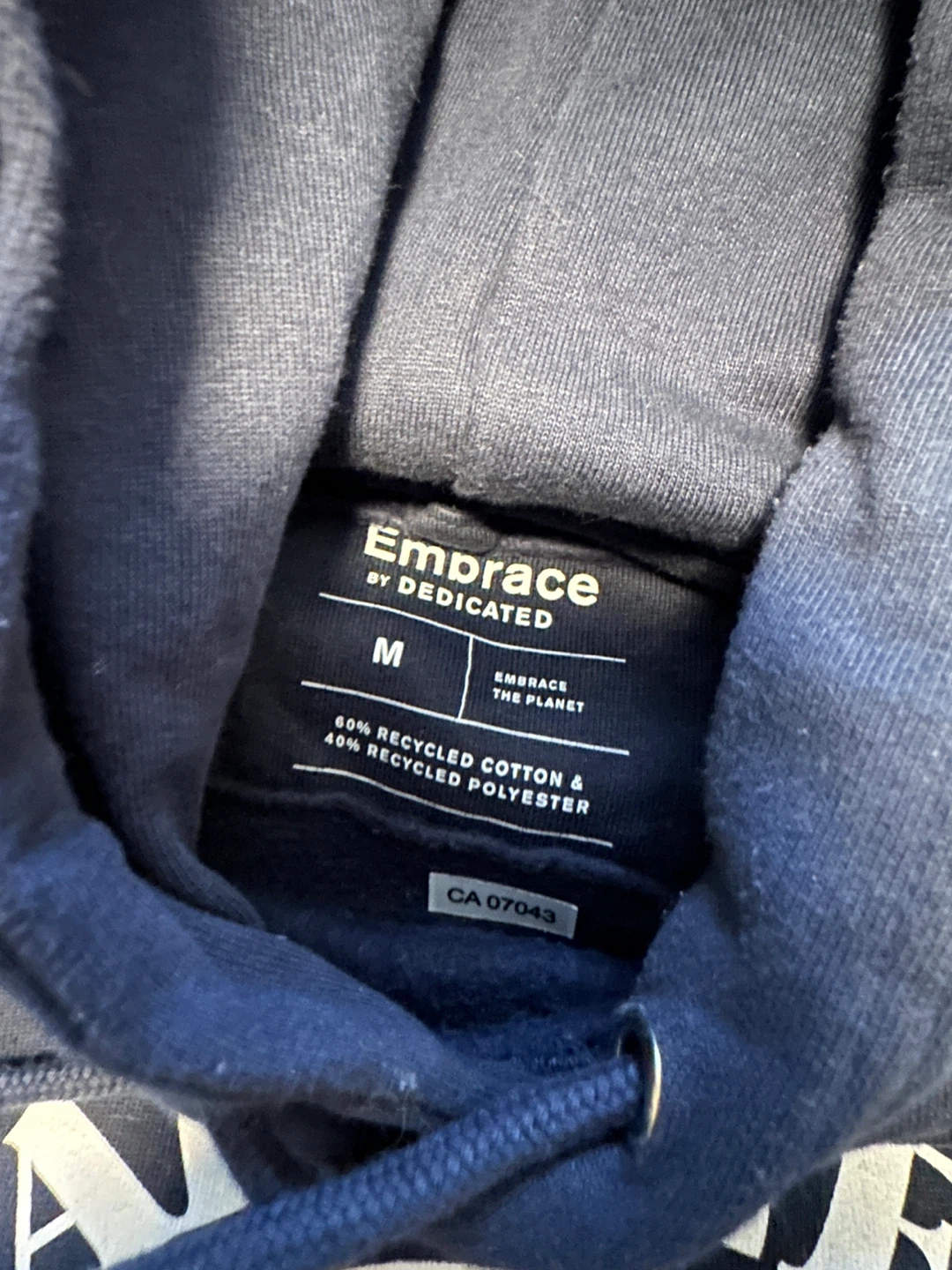 Navy blue hoodie by Embrace by Dedicated. Made with 60% recycled cotton and 40% recycled polyester. Size medium. Features a graphic print of waves with the text "Happiness Comes In Waves".