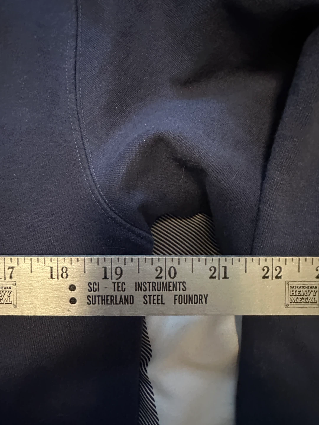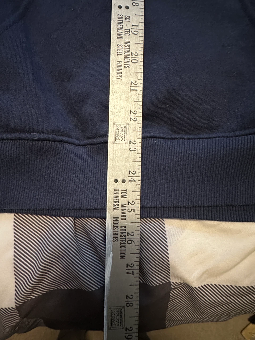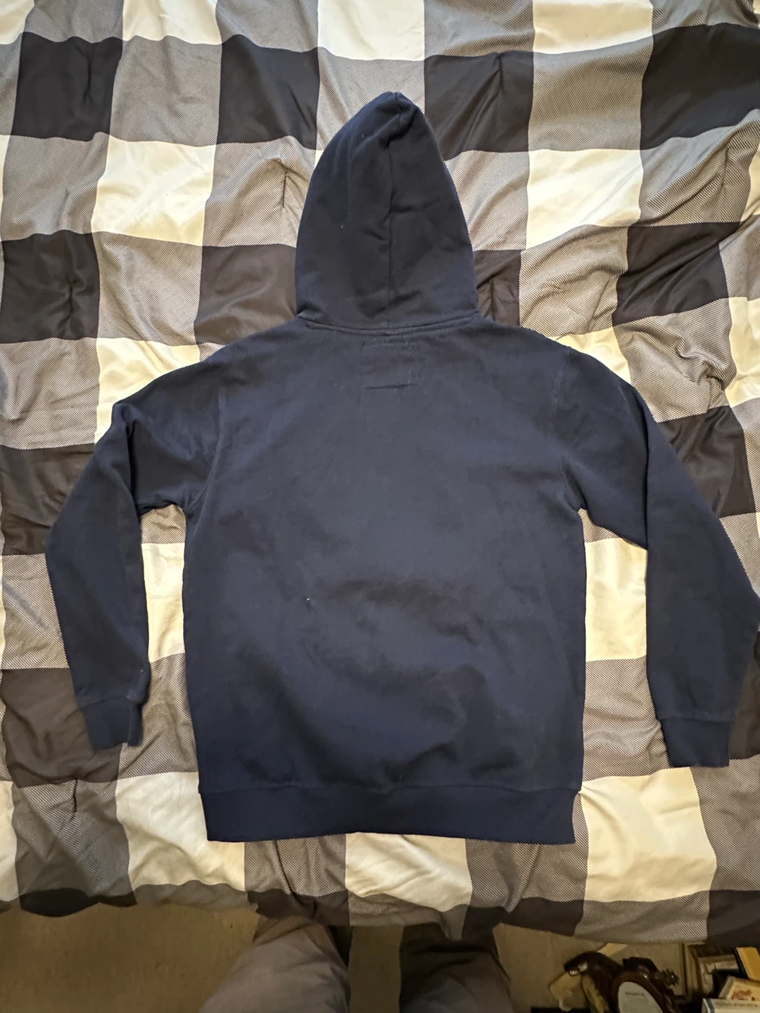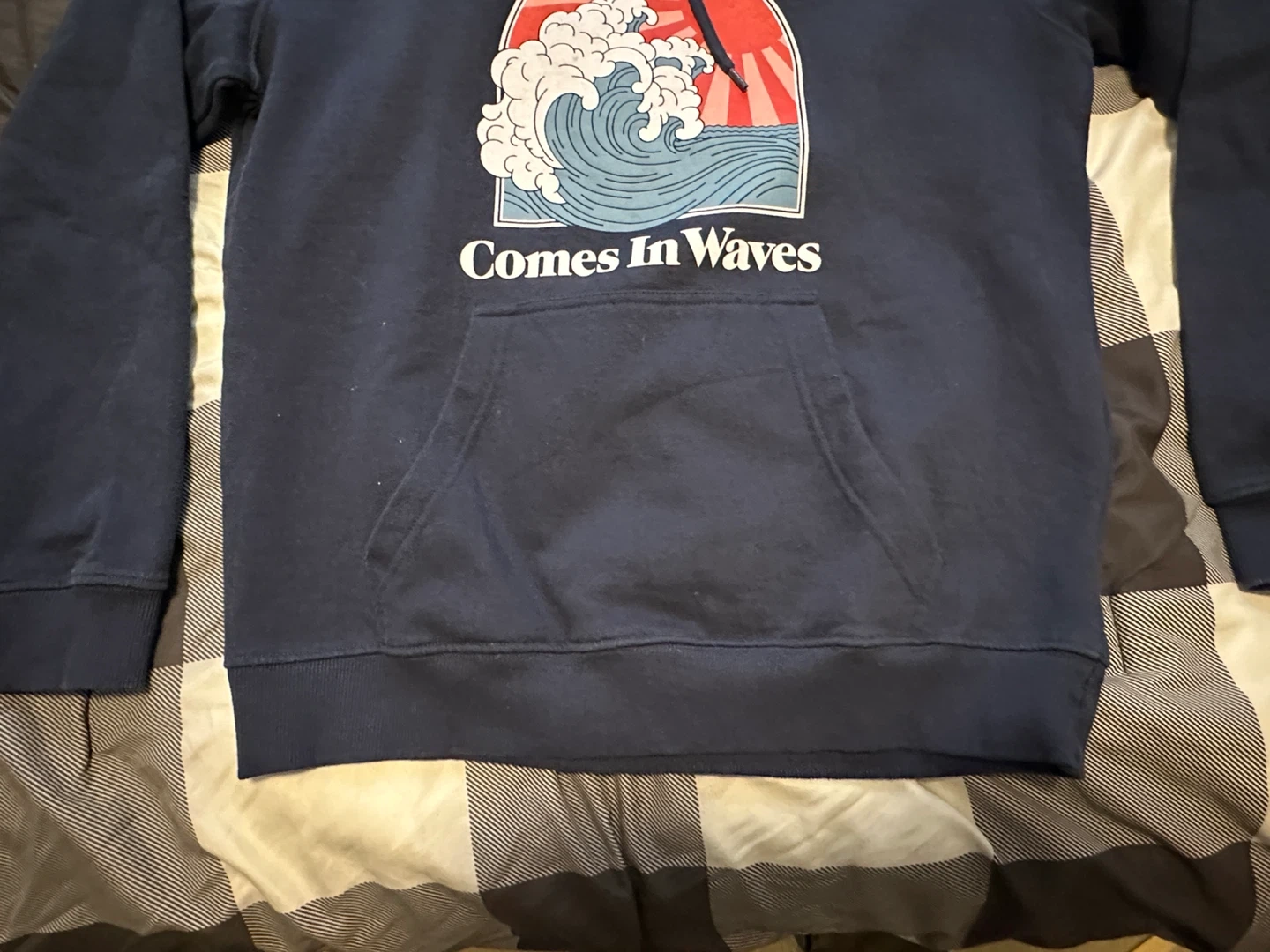 Navy blue hoodie by Embrace by Dedicated. Made with 60% recycled cotton and 40% recycled polyester. Size medium. Features a graphic print of waves with the text "Happiness Comes In Waves".