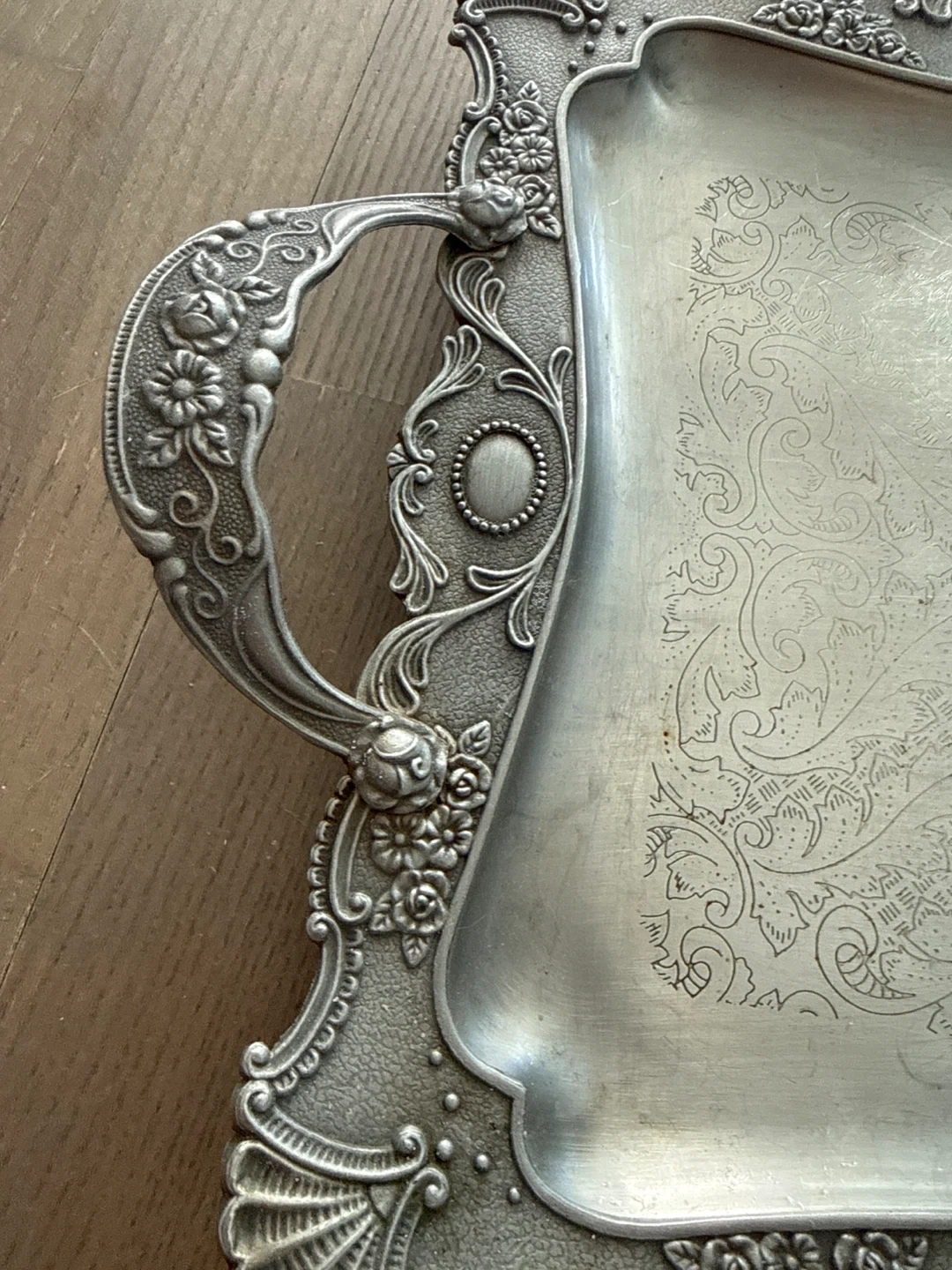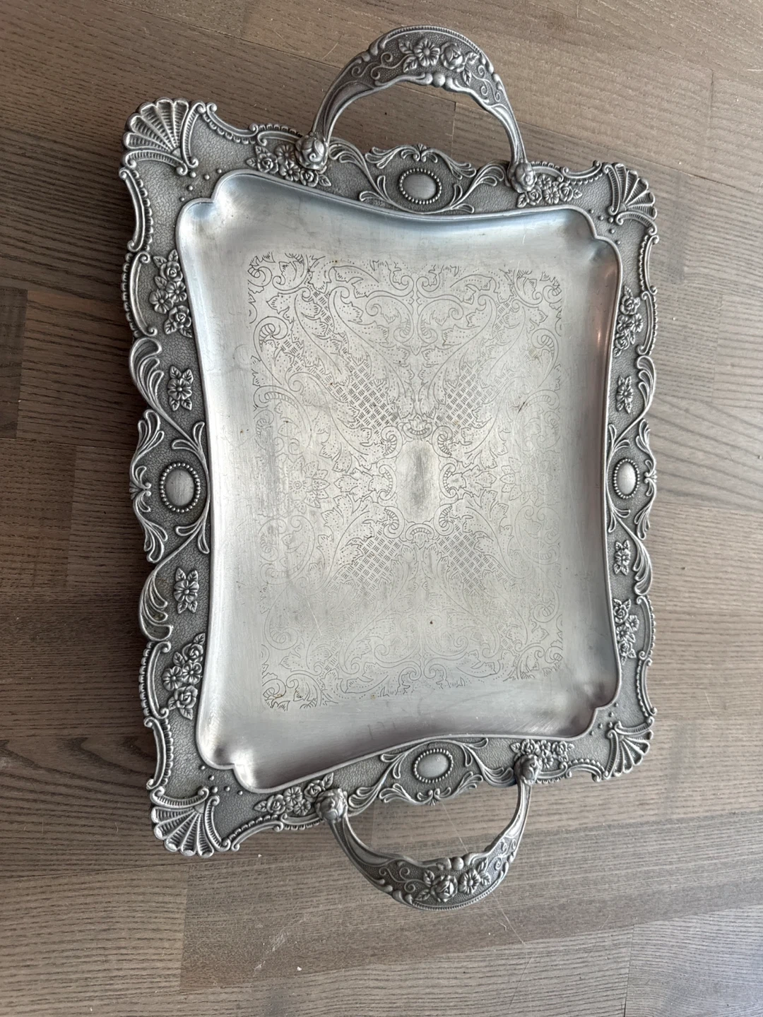 This decorative metal serving tray boasts an antique-inspired design with ornate floral detailing along the edges and handles. It's perfect for serving drinks or appetizers at gatherings. The sturdy construction ensures it can handle a good load.
