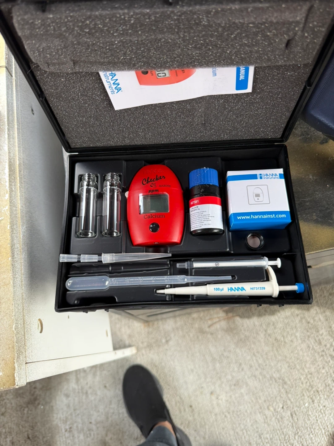 This handheld colorimeter is designed for marine calcium testing. It includes a meter, vials, pipettes, and reagents. Easy to use for accurate chemical tests in aquariums and marine biology. Small size, big convenience!