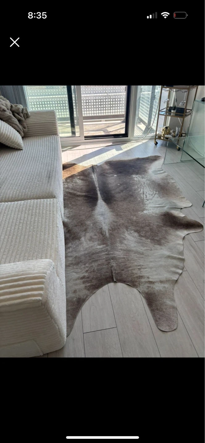 This is a natural cowhide rug with a brown and white pattern. It's a unique piece for your living space. Real leather material.