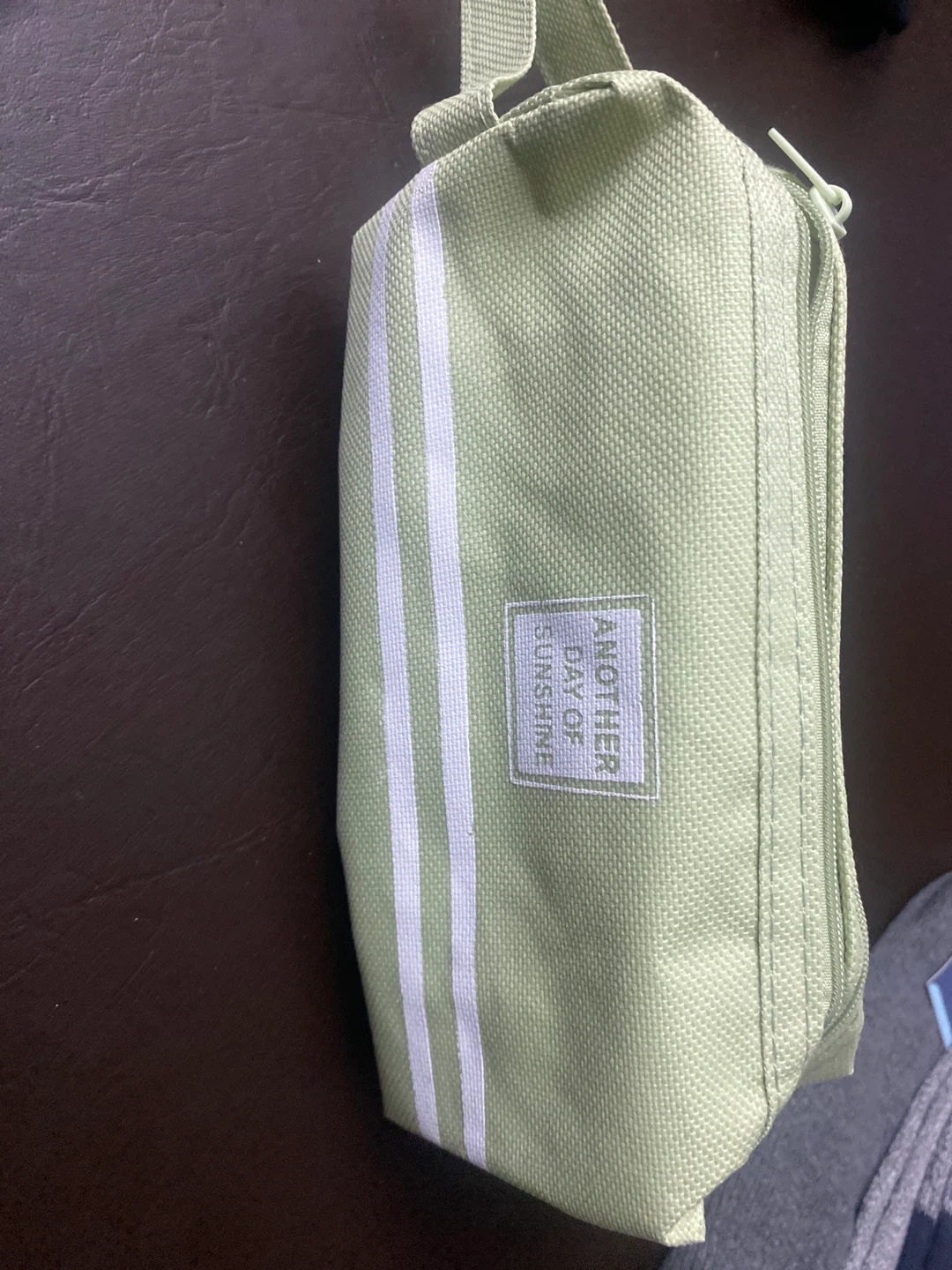 This light green zippered pouch features the text "ANOTHER DAY OF SUNSHINE". It has a canvas-like material with white stripe accents. It's perfect for organizing small items like pens or makeup.