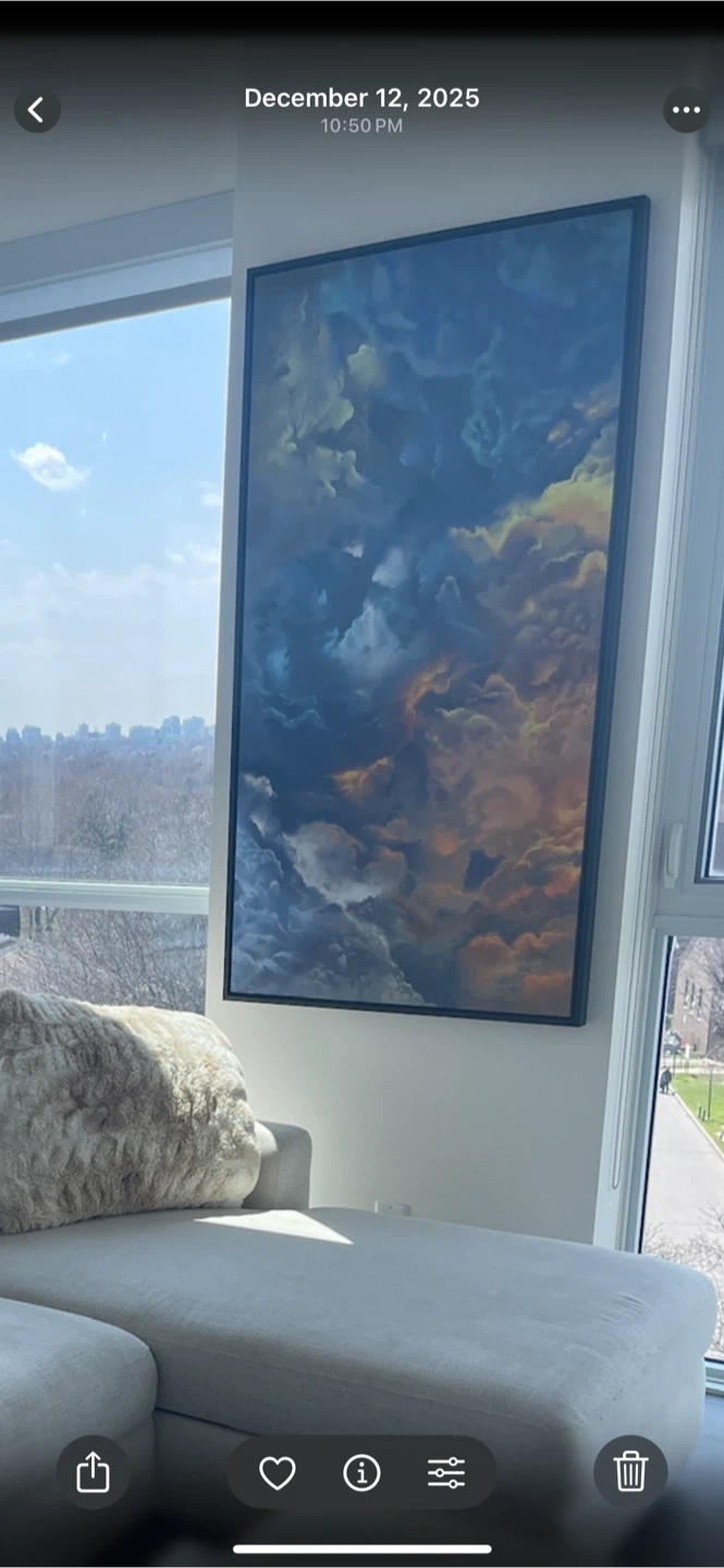 This large framed canvas art piece features a dramatic abstract cloudscape. It's painted with a mix of deep blues, greys, and warm oranges. Adds a bold statement to any room!