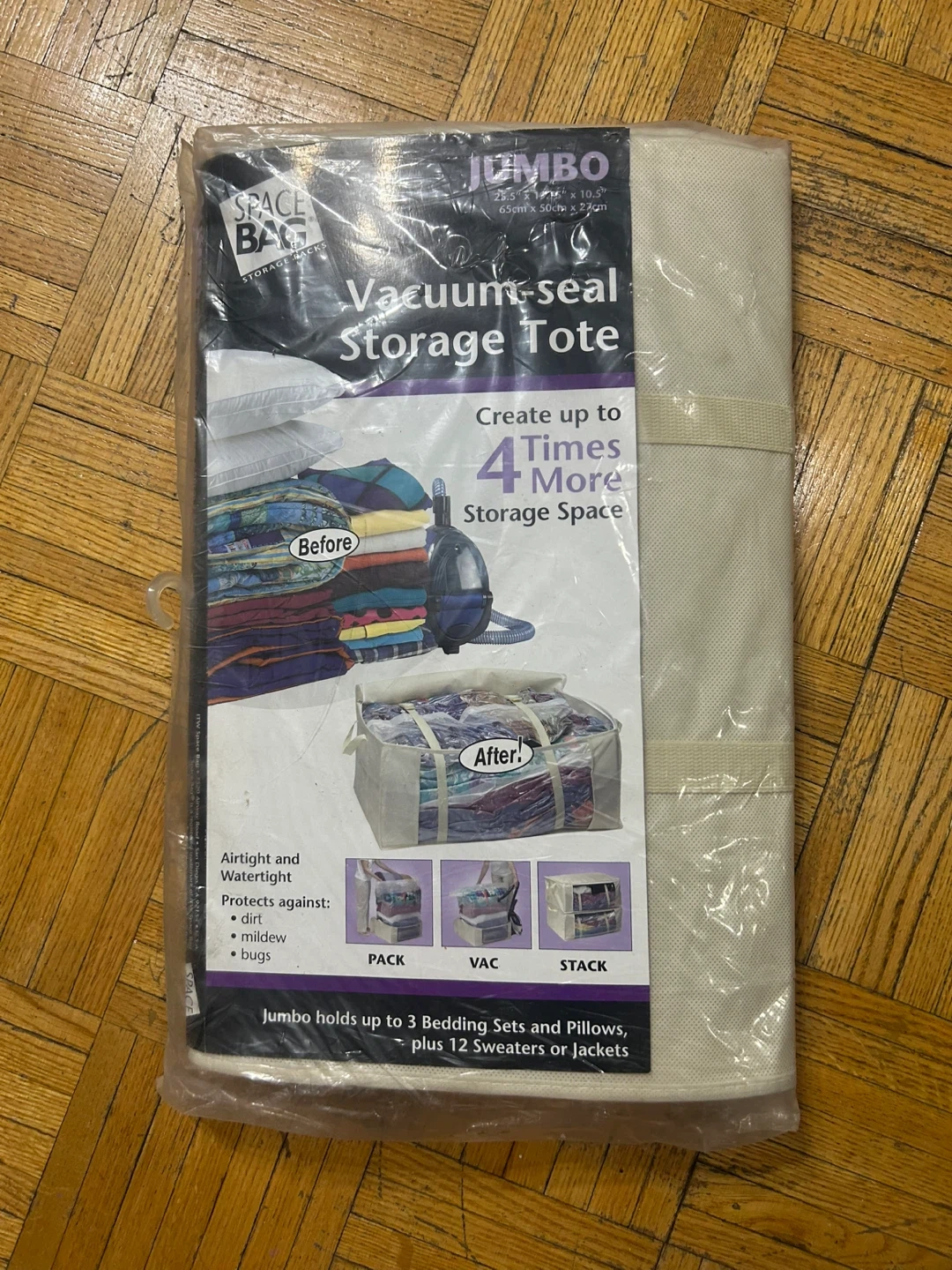 This jumbo vacuum-seal storage tote creates up to 4 times more storage space. It's airtight and watertight, protecting against dirt, mildew, and bugs. Jumbo holds up to 3 bedding sets and pillows, plus 12 sweaters or jackets.