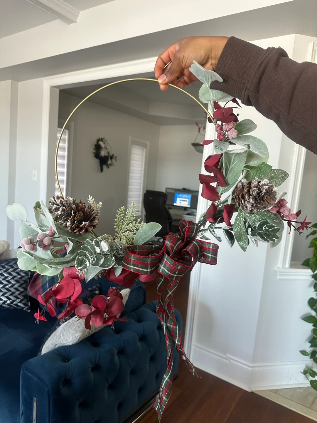 This festive handmade hoop wreath features a mix of greenery, red berries, pinecones, and a plaid ribbon. It's elegantly adorned with a gold metal hoop base. This wreath is perfect for adding a touch of holiday cheer to your home!