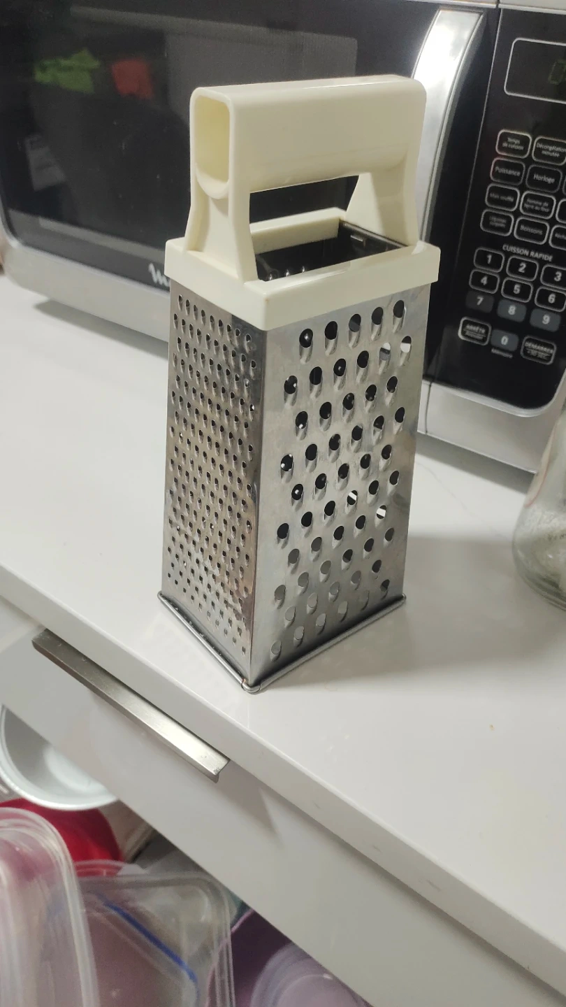 This is a 4-sided box grater made of stainless steel. It features different grating surfaces for various needs. The handle is a pale cream colour.