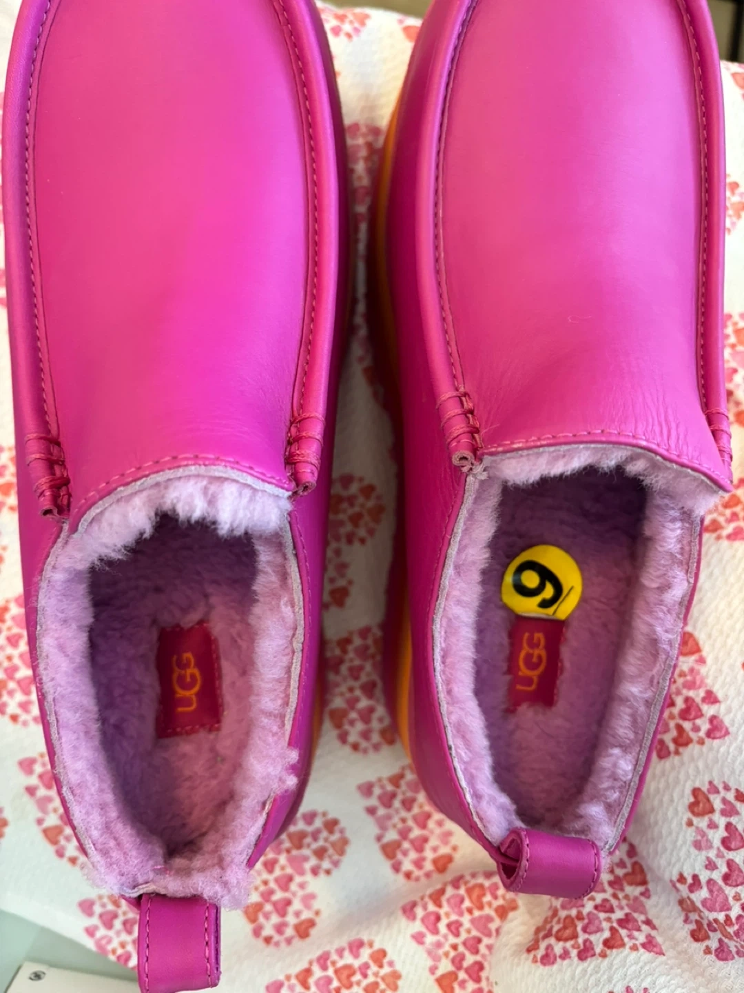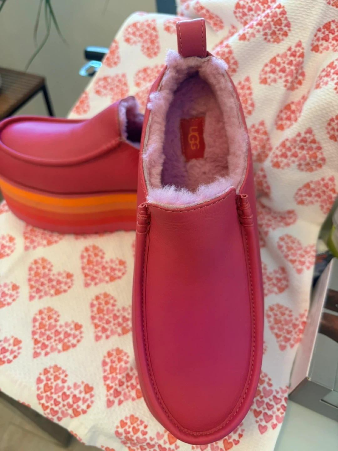 These UGG slip-on shoes are a vibrant pink colour and feature a cozy faux-fur lining.
