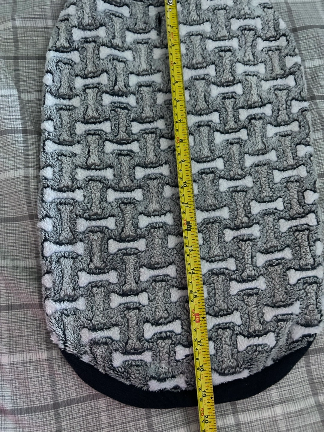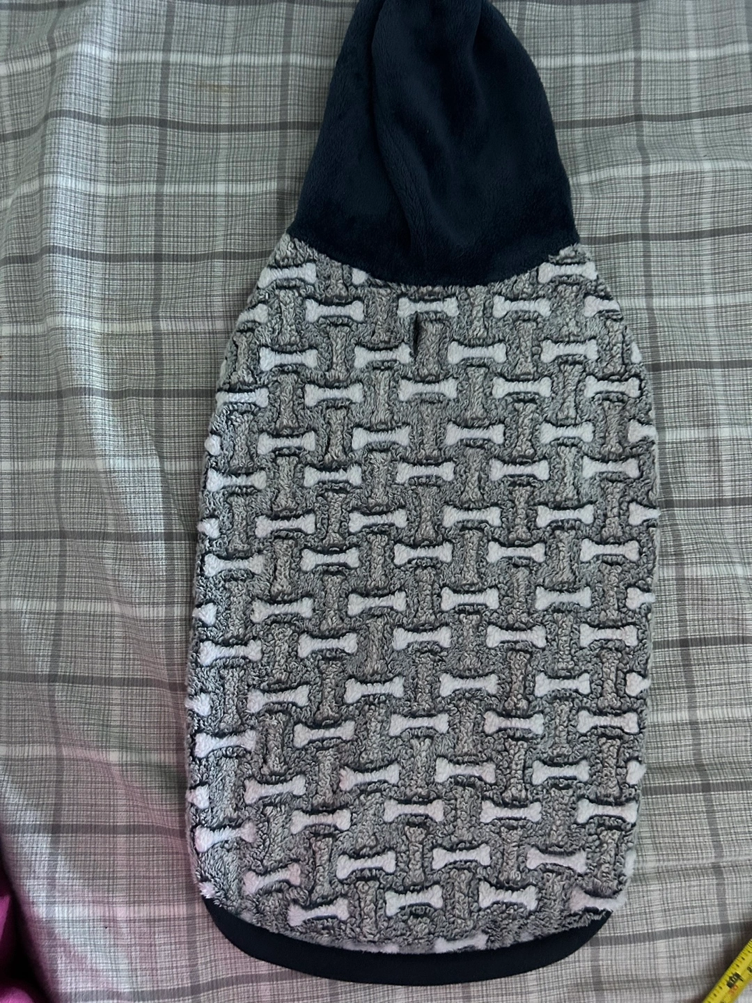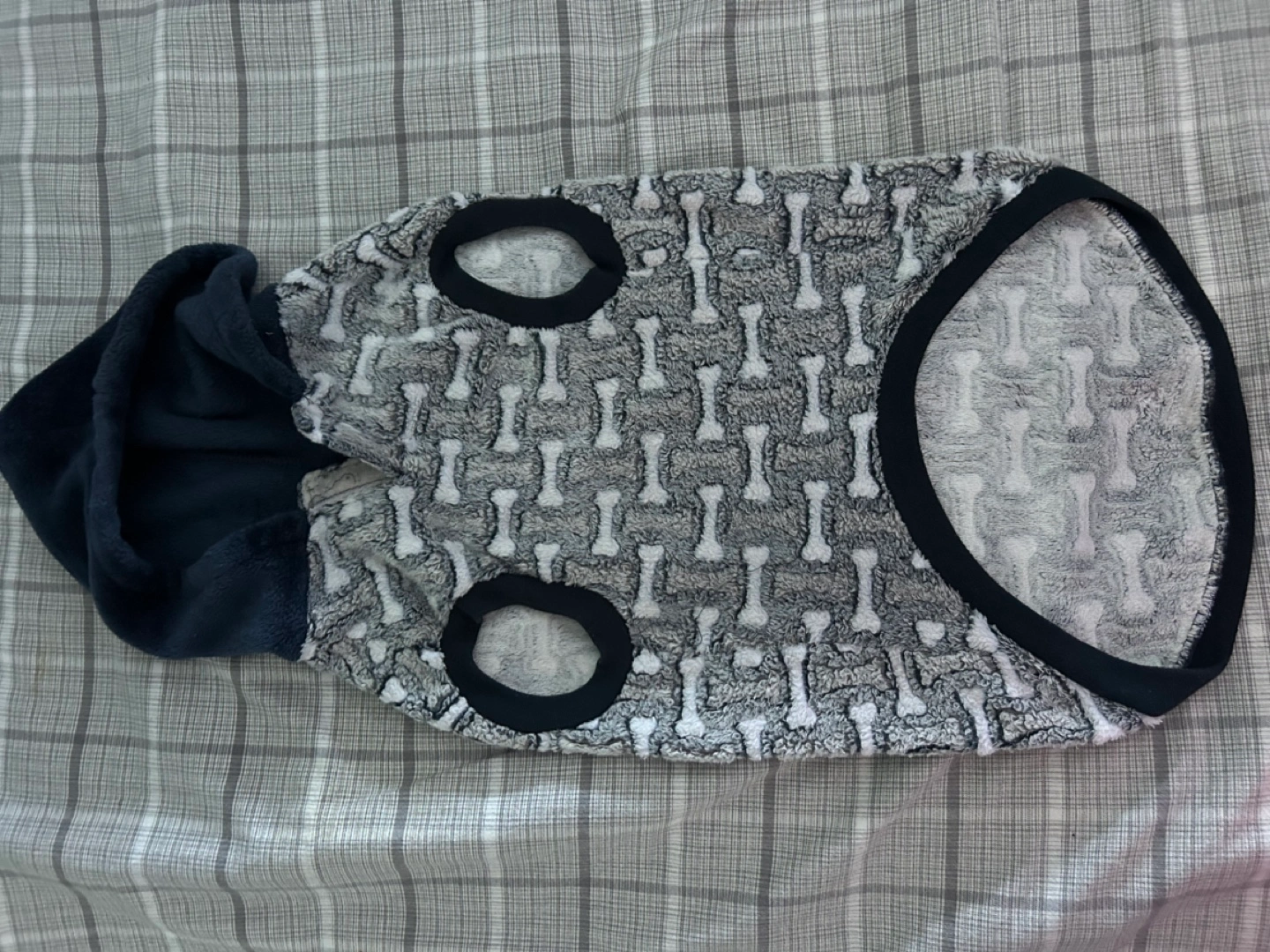 Grey and navy dog sweater. Bone pattern. Very Soft stretchy material like velour. Hoodie style.