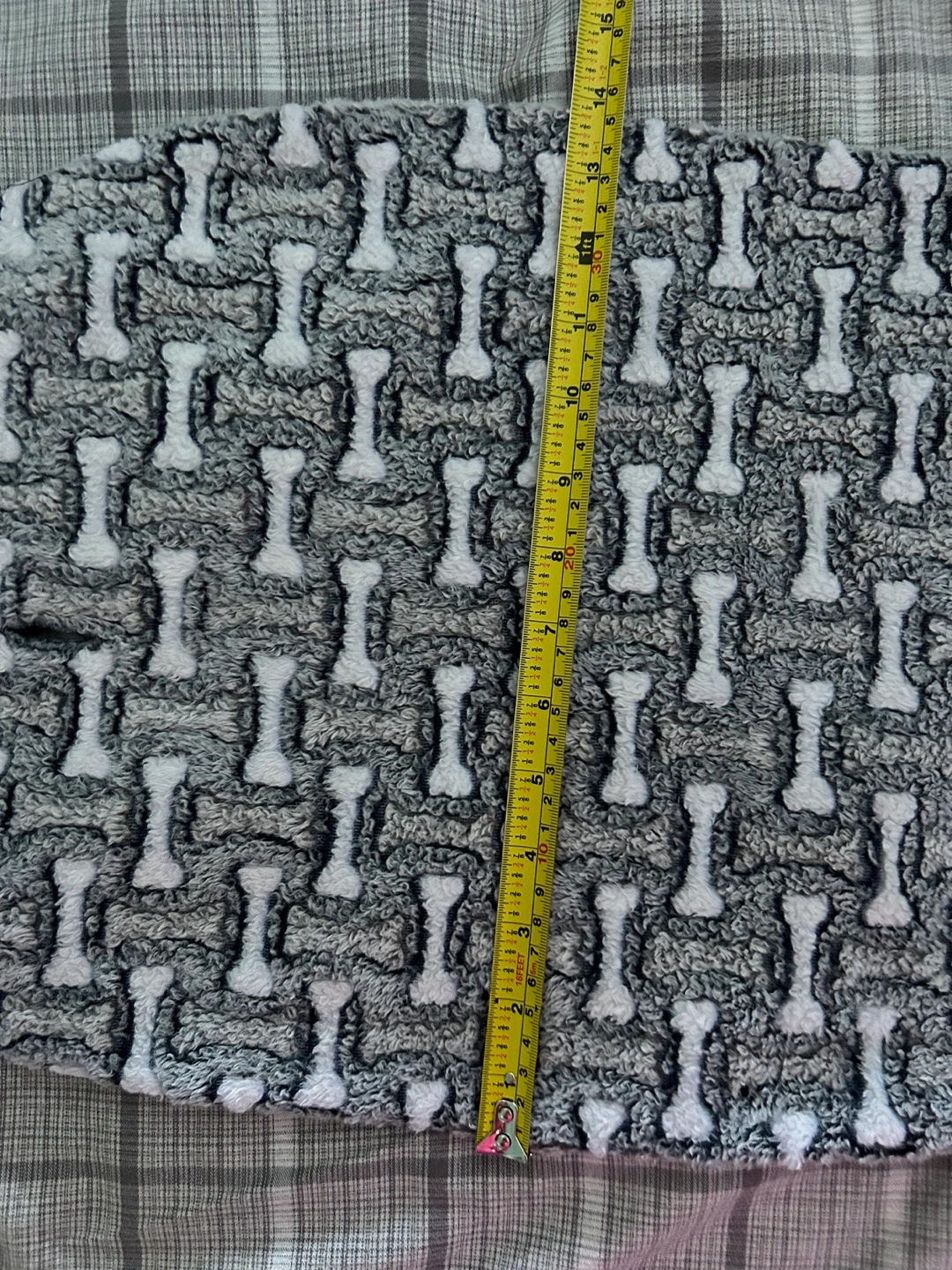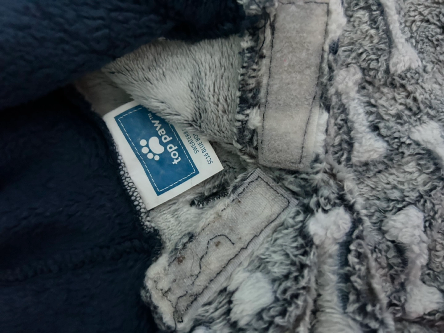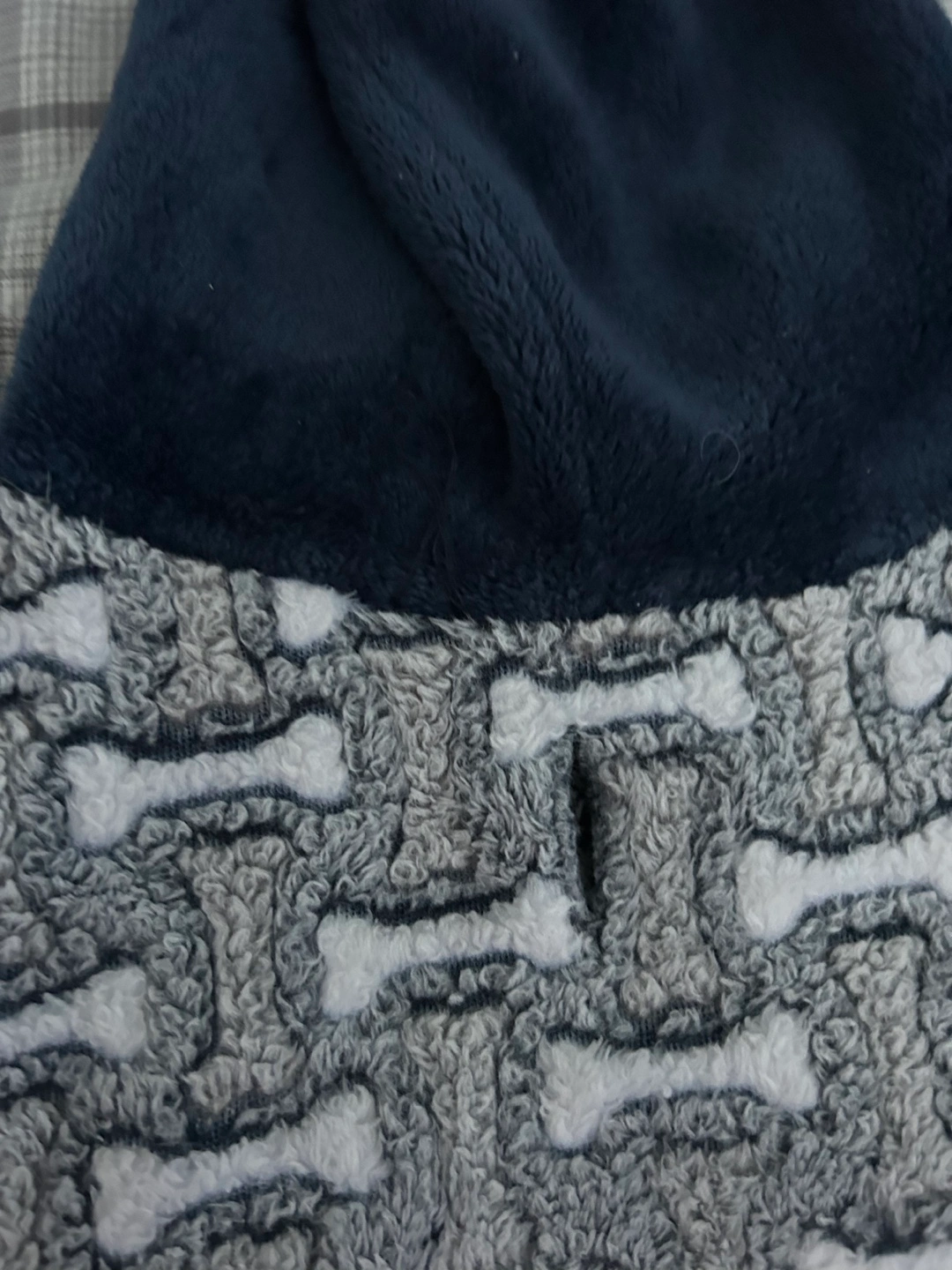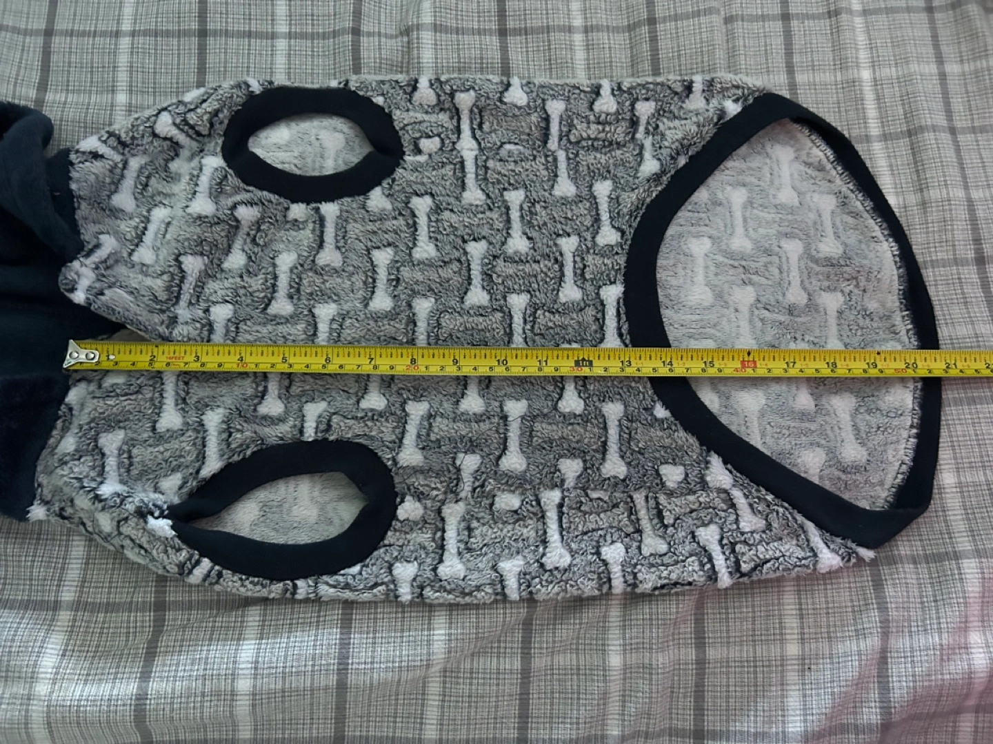 Grey and navy dog sweater. Bone pattern. Very Soft stretchy material like velour. Hoodie style.