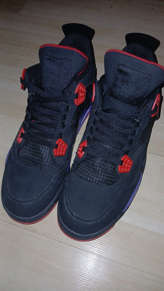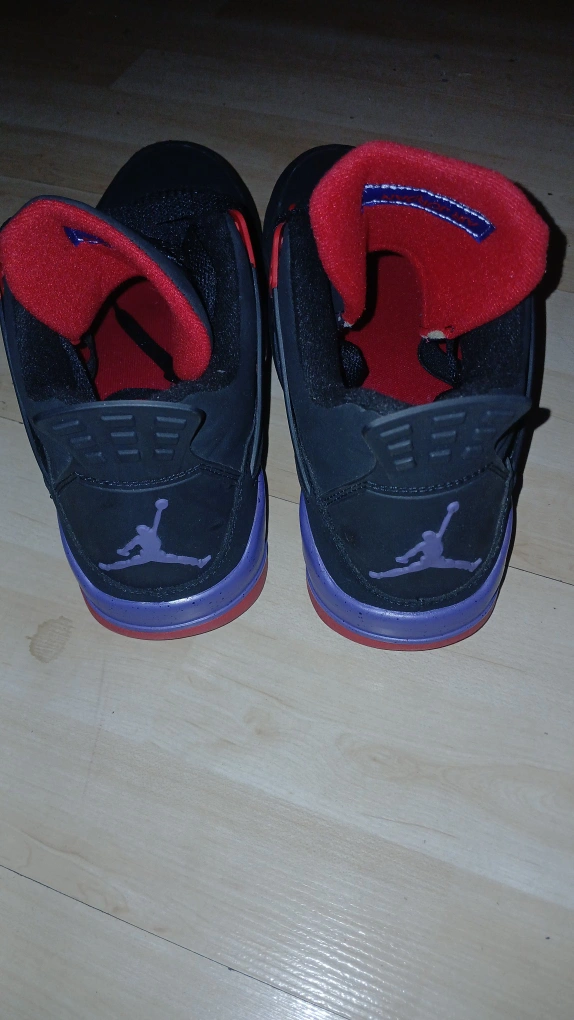 Men's Air Jordan 4 sneakers. Black suede upper, red accents, purple outsole. Pre-owned, size not specified. reps