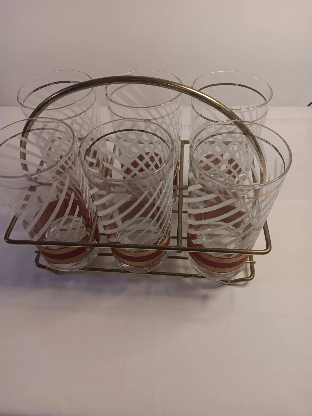 This is a set of six vintage drinking glasses. They feature a red and white striped pattern with gold trim. The glasses come with a metal carrier. They're perfect for serving beverages!
