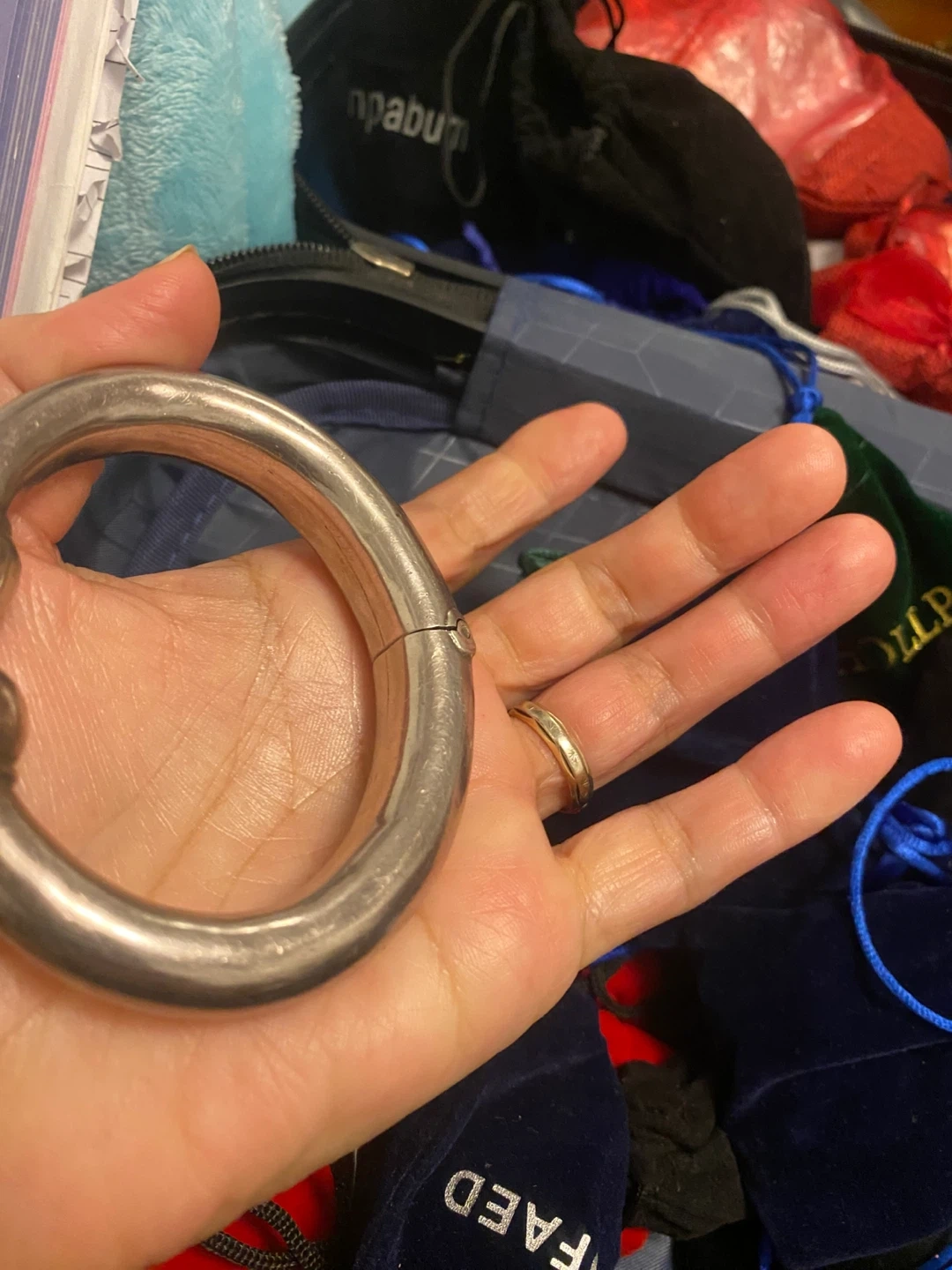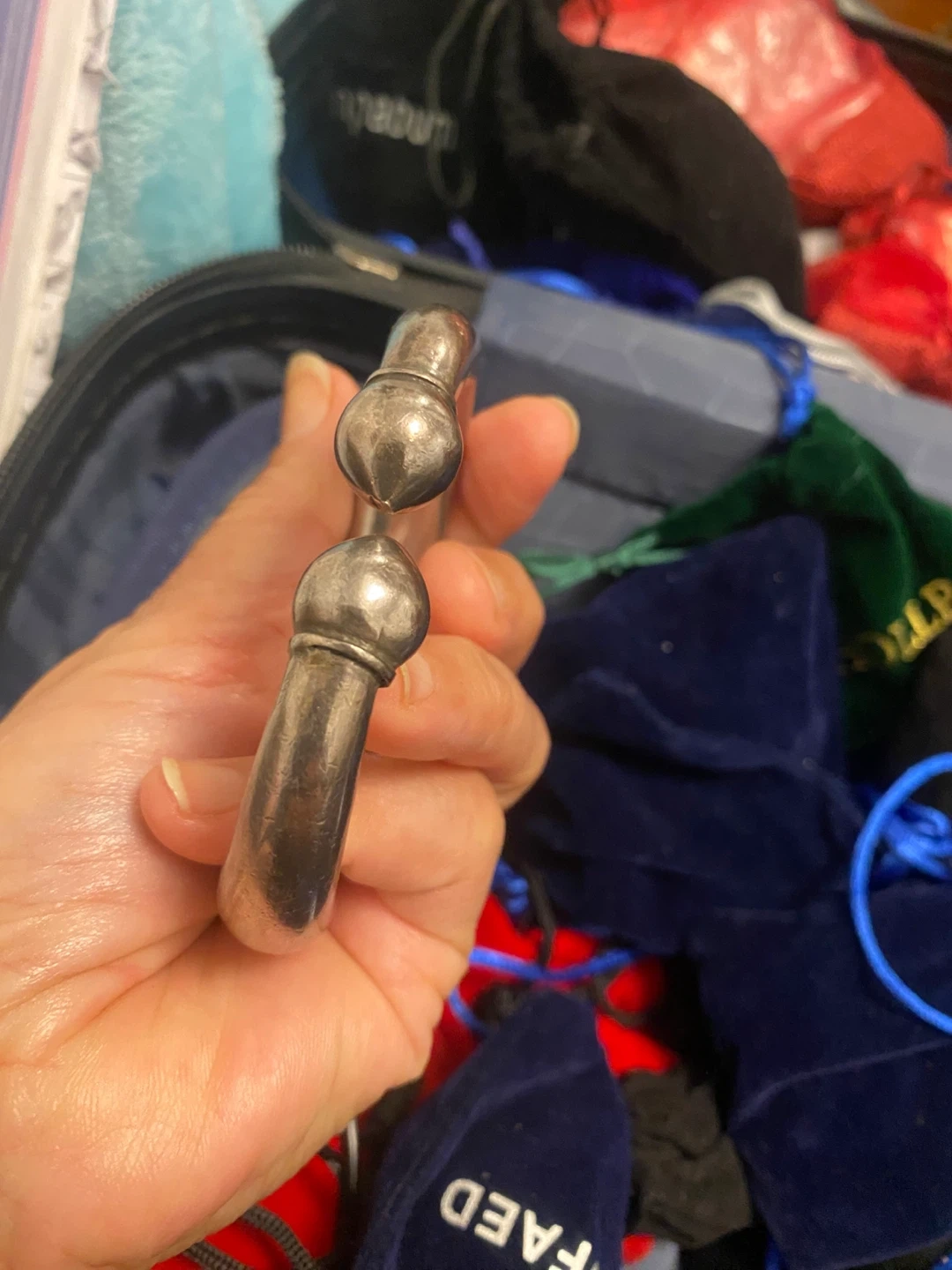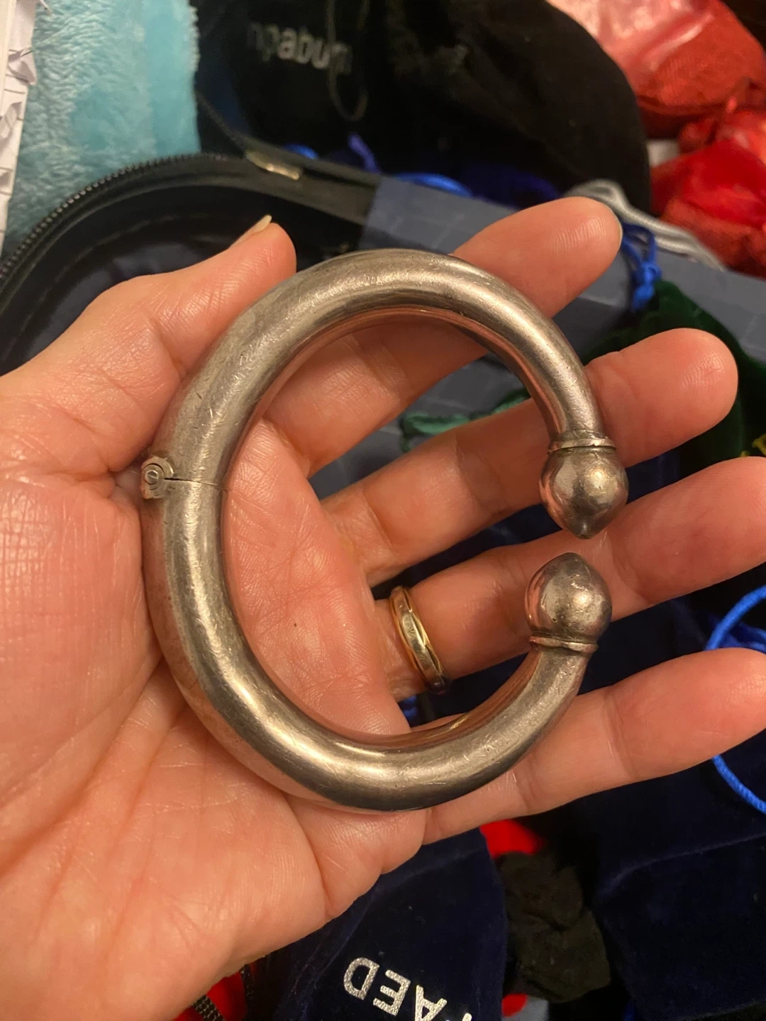 Selling a silver bangle bracelet. It's in good condition and has a unique design with rounded ends. A great addition to any jewelry collection! Weight 66 grams.real silver. 925 stamped.