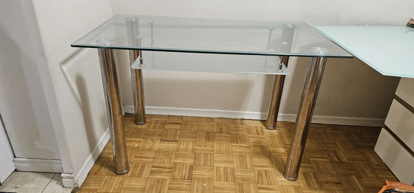 Dining table with a clear glass top and a lower shelf. It has four sturdy metal legs and silver accents. This table offers a sleek, modern look for your dining space.