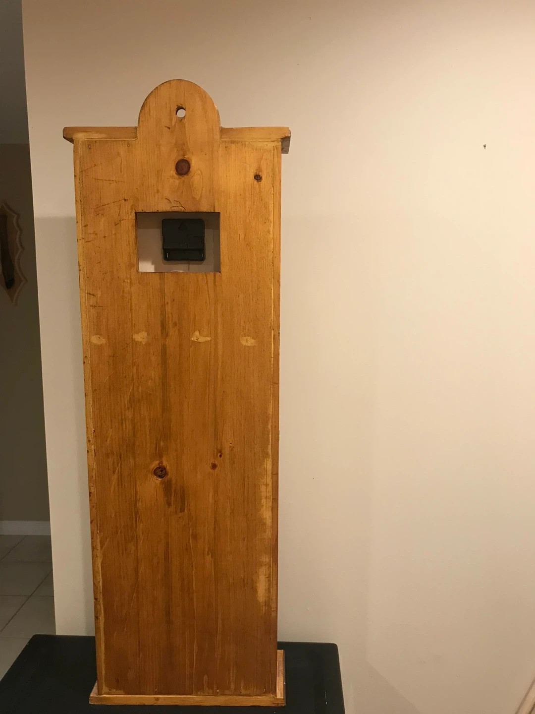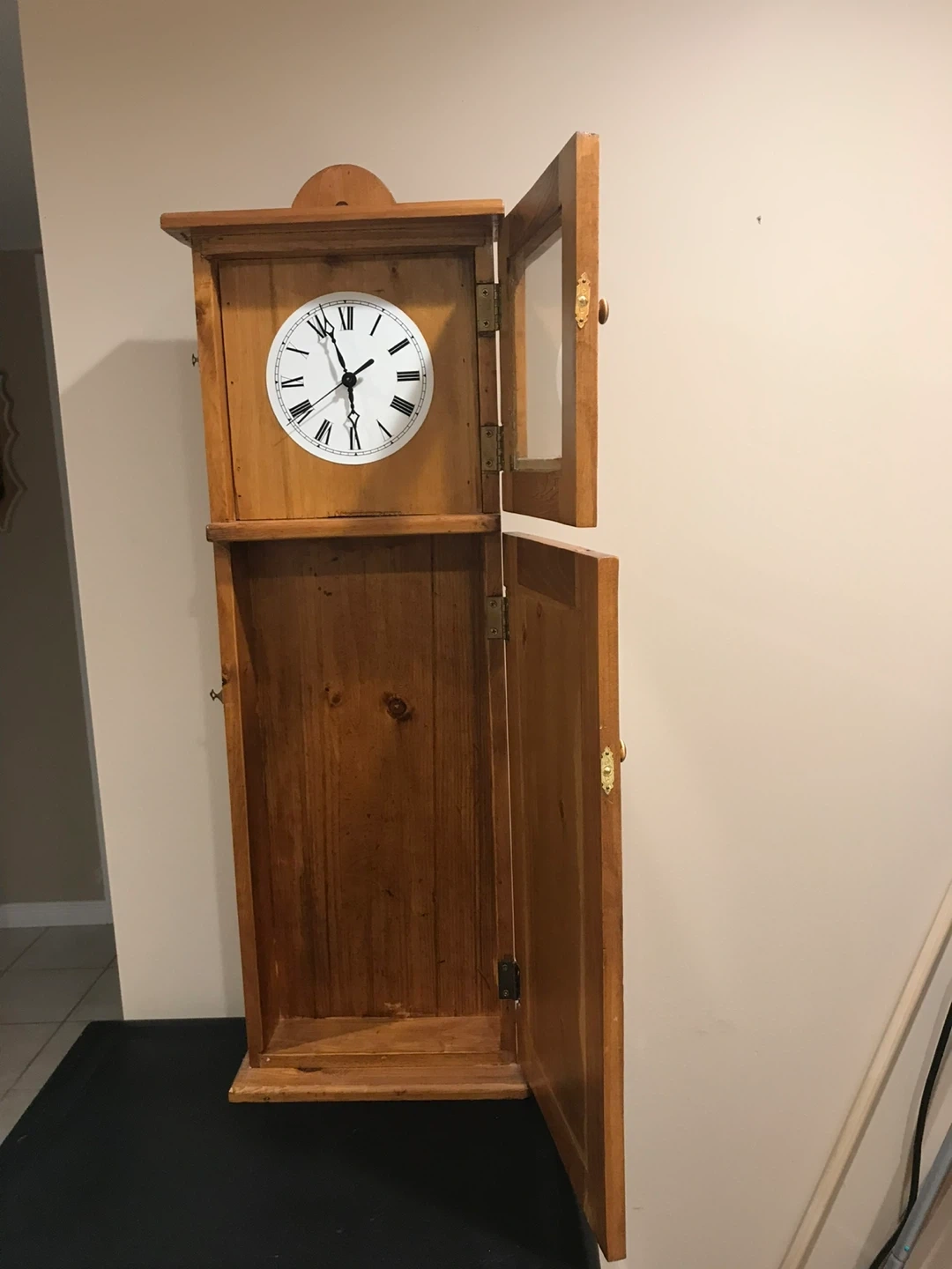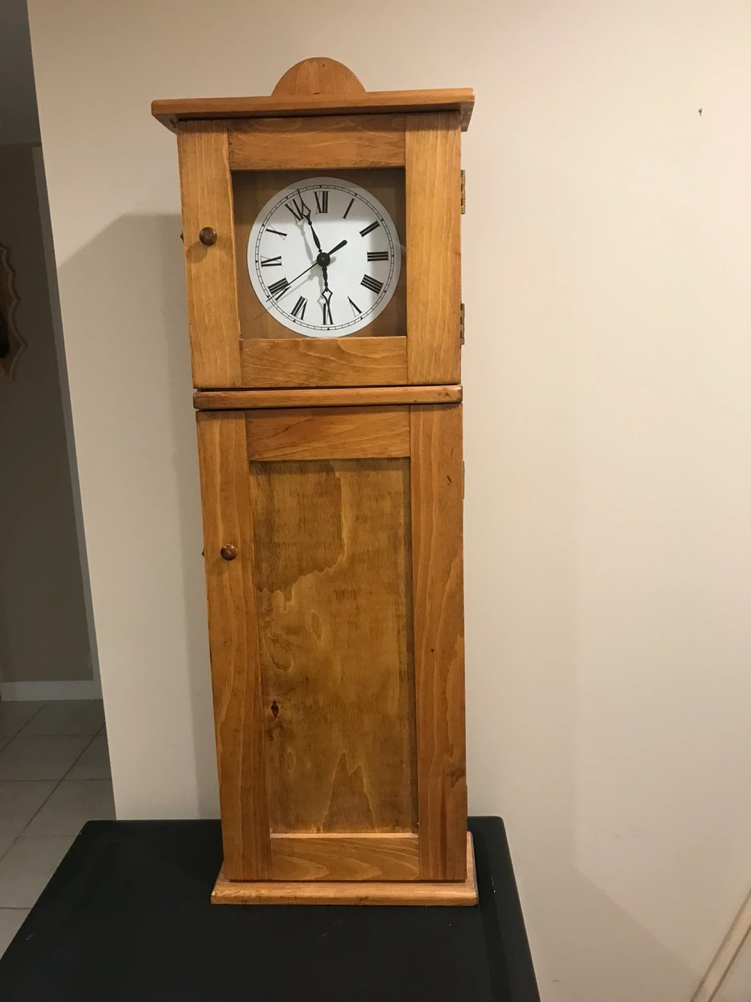 This is a classic wooden grandfather clock. It features a clear analog clock face with Roman numerals. The wooden casing has a warm, natural finish.