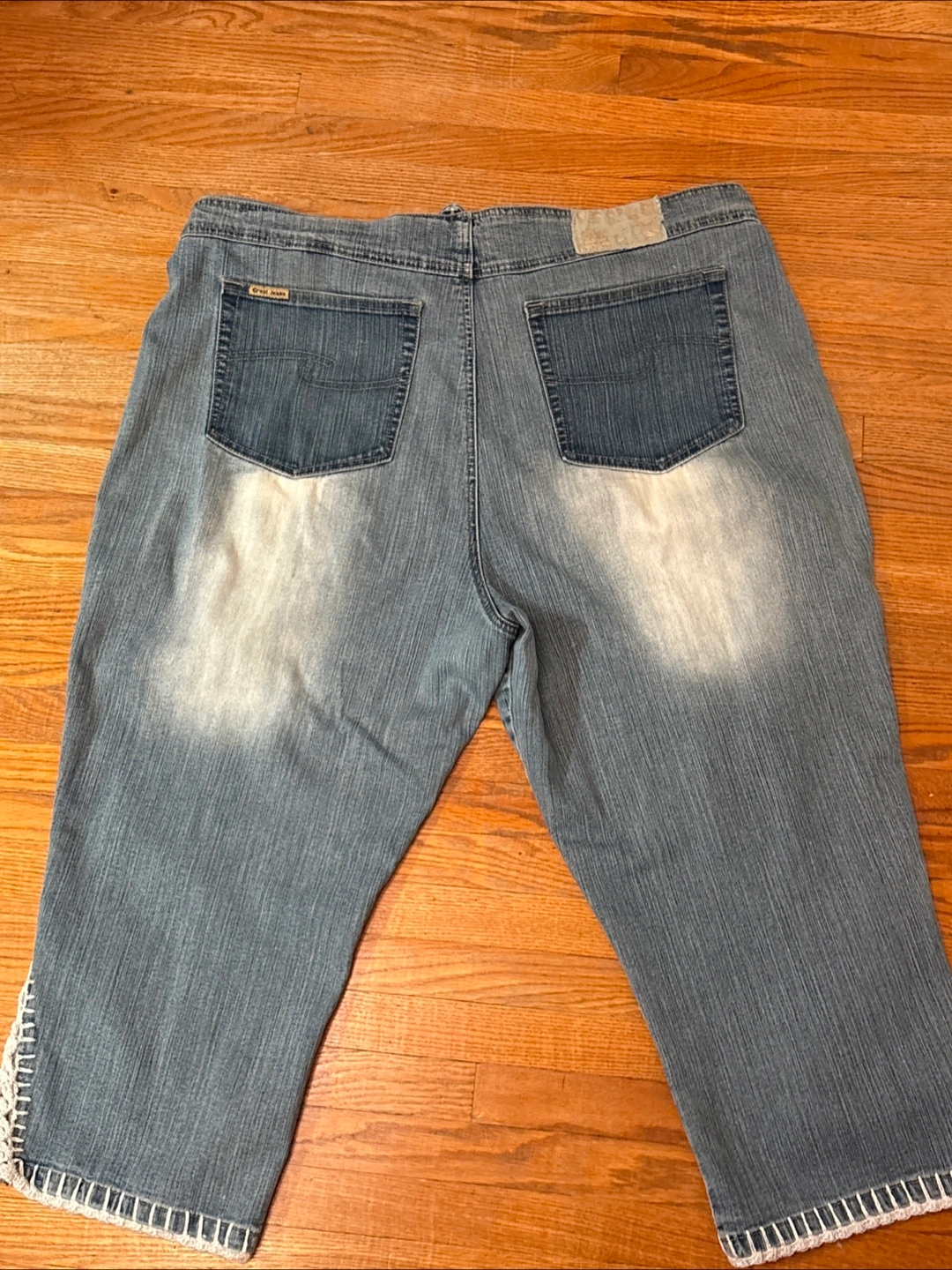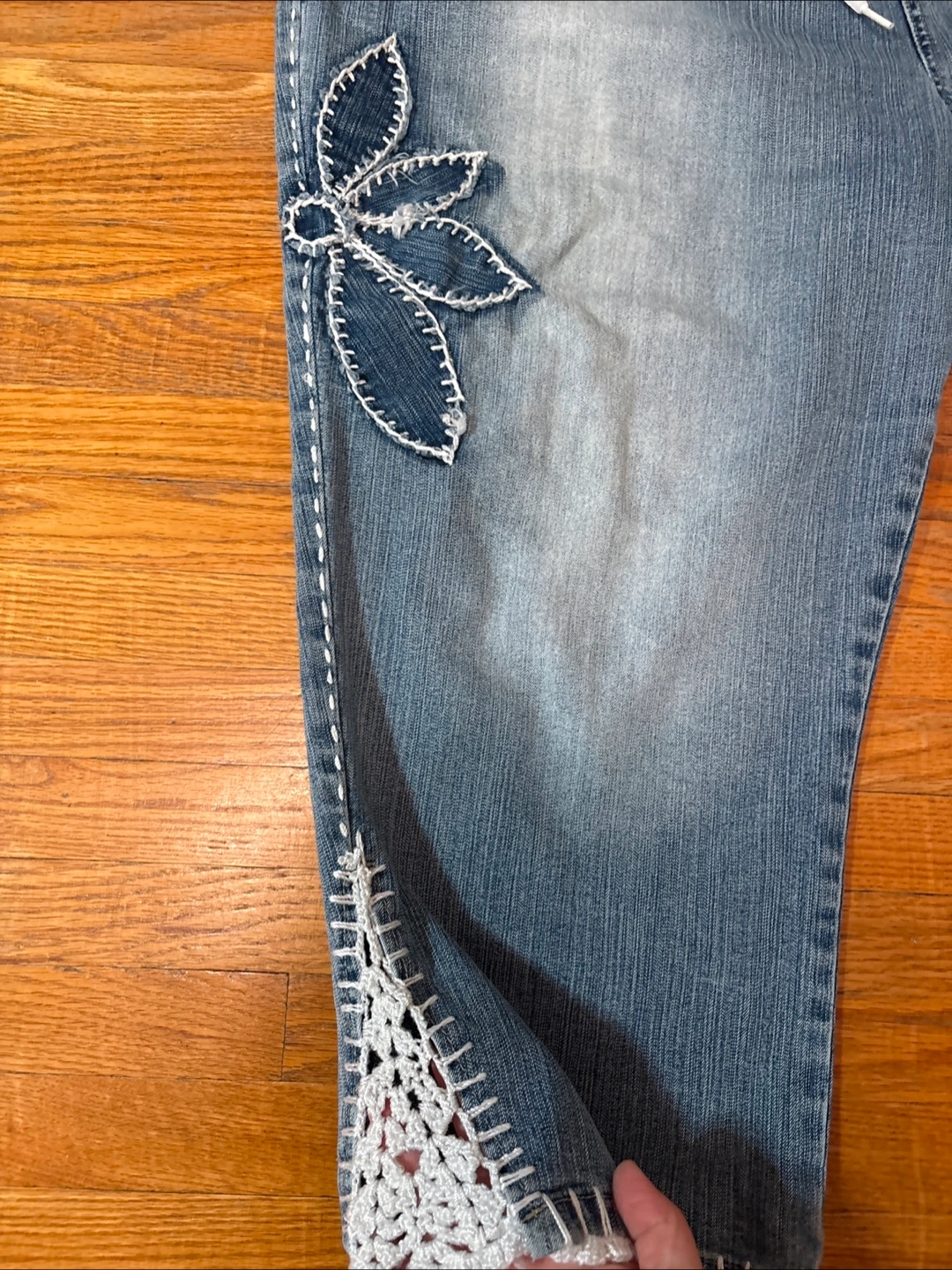 These are Crest Collection denim capri pants in a size W23/24. They're made of 96% cotton and 4% spandex. The pants have a unique design with floral appliques and lace detailing at the hem. Perfect for a casual, stylish look!